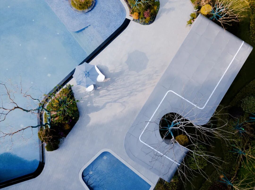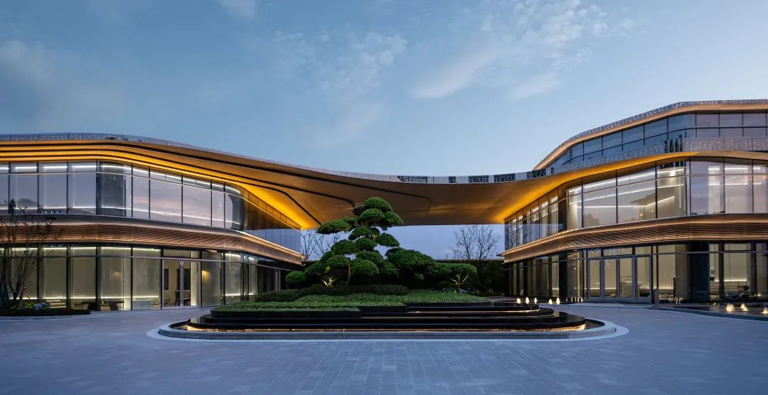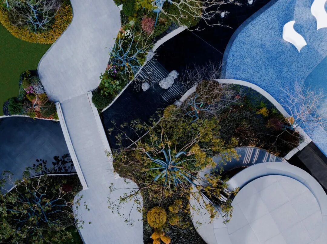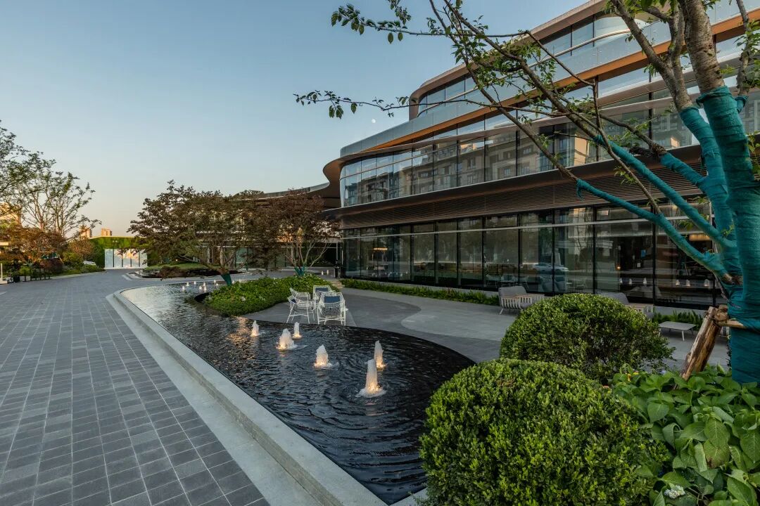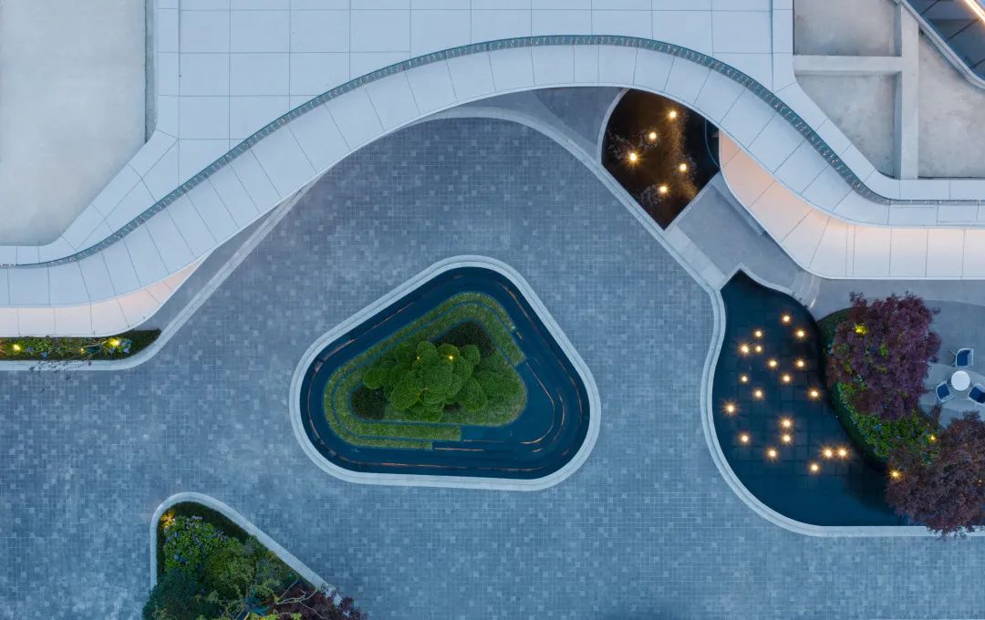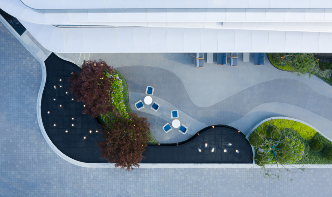 建筑线条摈弃传统的横平竖直,用丝绸般蜿蜒的流畅线条包裹,景观设计延续了这一设计理念。