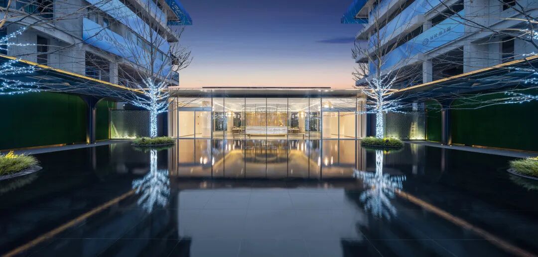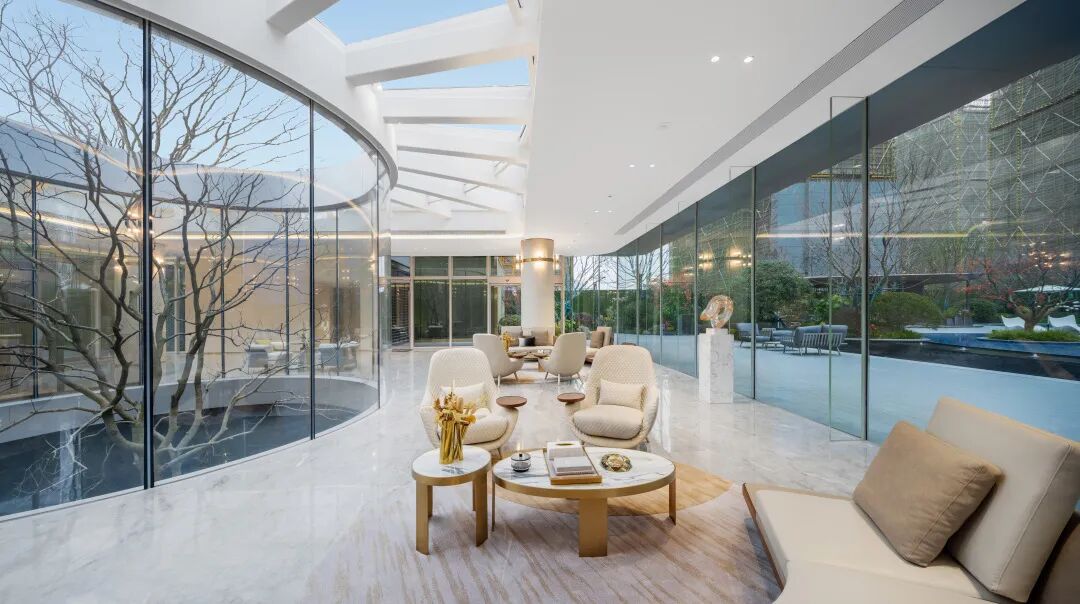 会客小坐于此,视线开阔,目及之处水景倒映着建筑的灵动线条,天光环绕,自在惬意。