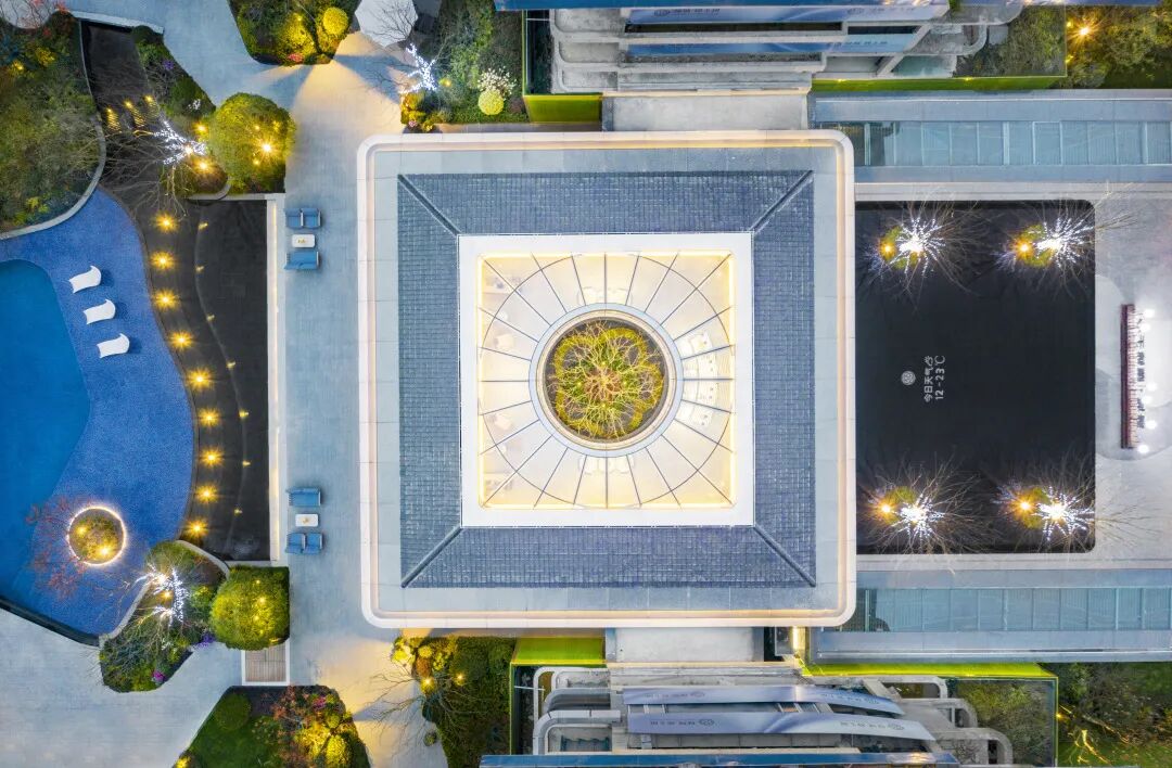 将阳光绿植引入大堂,屋顶洞开一隅,日光洒入室内空间。内外相映成趣,室内外景观相融形成丰富的感官体验。