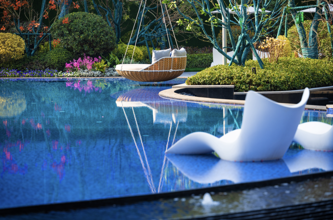 蜿蜒环绕的泳池⽔流潺潺,提⽰访客即将脱离喧嚣, 层层绿叶下,水⾯如镜,平静的池⽔与树的倒影微动,⼀座世外桃源倒映在眼前。