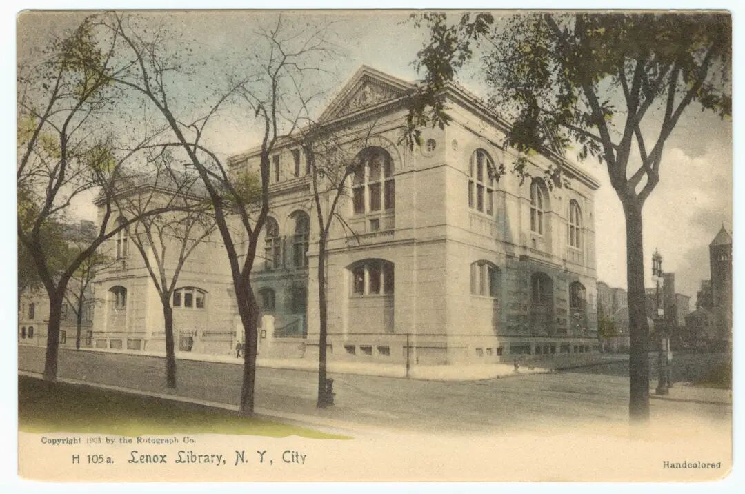 莱诺克斯图书馆在1877年到1912年位于曼哈顿上东区第五大道,它始于藏书家詹姆斯·莱诺克斯的个人收藏,以前这些收藏在他的联排别墅中存放,只有他知道编目系统,后来慈善家莱诺克斯决定建一个单独的机构来存放他的书。