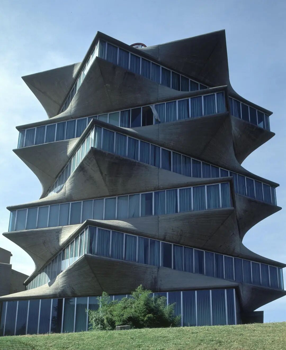这座位于西班牙马德里的建筑正式名称为Laboratorios Jorba (乔巴实验室),但由于与佛教寺庙相似,人们简称它为宝塔。由西班牙建筑师米格尔·菲萨克设计,每一层都从它下面的一层旋转了45度角。菲萨克以对混凝土的热爱而闻名,他也是西班牙现代设计的领导者。