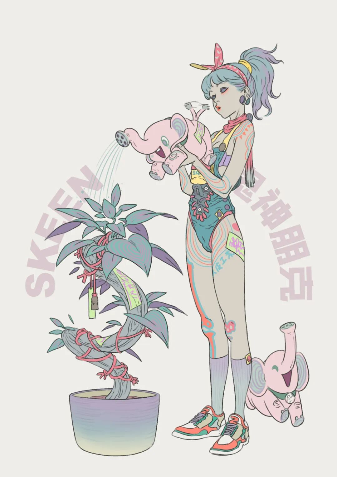 鬼神朋克 SKEEN 系列,也是 Zeen Chin 的另一代表力作。鬼神朋克的世界是一个未来看似发达但混沌的世界。人类已经把科学和玄学结合起来,证实了灵异世界的存在,因此解答了很多科学无法解释的东西,也达到了另一个文明的高度。