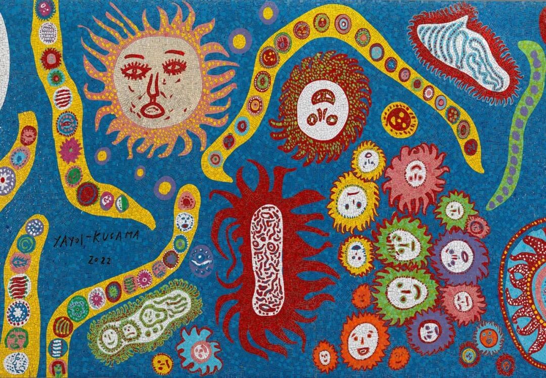 草间弥生875平方英尺的壁画《爱的讯息,从我的内心直达宇宙》 (A Message of Love, Directly from My Heart Unto the Universe,2022) 以大胆的色彩为细节,涵盖了草间弥生的许多标志性图像,包括斑点、人物图案、风格化的太阳和笑脸等。在附赠的一首诗中,艺术家写道:“我给你一个爱的讯息,从我的内心直达宇宙。愿你们都能体验爱人类的真正美好之处。我的愿望是,用我的全部生命,把这一愿景传递给纽约人民。”