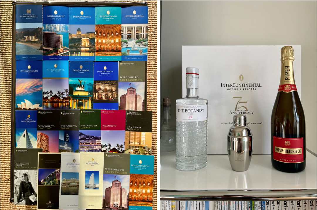 ▲ 我收集的部分洲际酒店rack brochures;洲际为庆祝其75周岁诞辰创作的「洲际75周年特调鸡尾酒」的基酒——白雪香槟和植物学家金酒。
