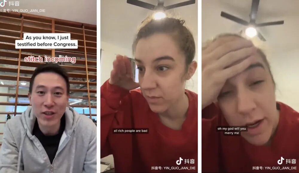 不止是中文互联网,国外网友也对周受资倾心不已。一则短视频中,TikTok 用户对着周受资“自我催眠”:“这是 CEO,是导致问题出现的原因之一,再说所有富人都是坏人。”短视频的戏剧性在话音落下的一瞬间展现,她紧接着说道:“求你娶我。”