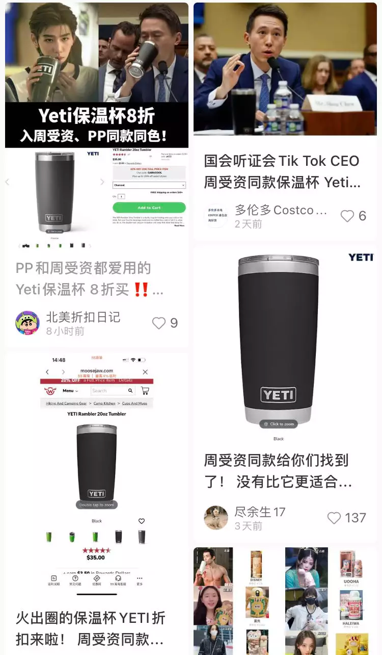 周受资“受难”的5个多小时,他身边的 YETI 保温杯悄悄出了圈,购物博主纷纷顶着“周受资同款”的噱头开始上链接。