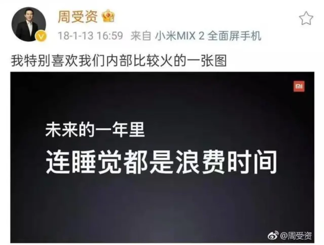 雷军曾经评价周受资“有一种对世界复仇一般的勤奋”,周受资任职于小米时,也曾豪情万丈地转发过:“未来的一年里,连睡觉都是浪费时间。”