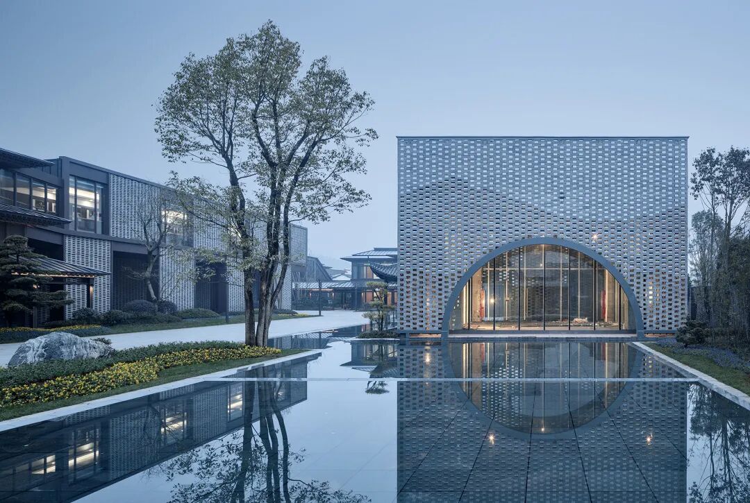 群组内部,通过水面的设置,形成了”明月江南”的中式传统诗词情境。连廊与建筑形体则形成了多多处院落空间,向古镇的传统建筑院落致敬。