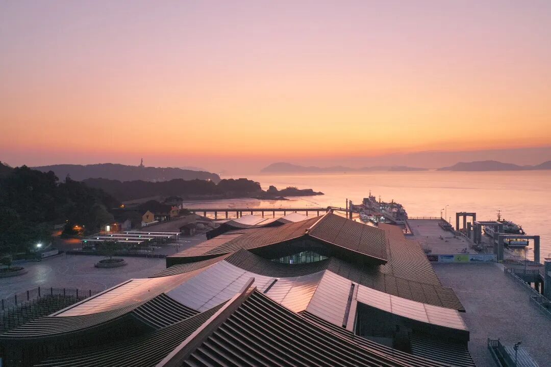 打破常规交通建筑大体量与标志性的特点。用错动的平面消减建筑体量,用压低的屋檐减缓视觉压力,让码头成为登岛敬佛的通过性空间和虔诚的起点。