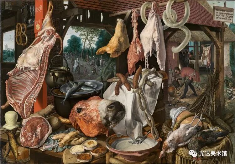 探索由rhyparos(废物)这一概念所启开的多义性领域正是那一系列微言大义、引人入胜的图像的指归所在;这些图像把现实的“高级”和“低级”的层面置于直接冲突的过程中。不过,它们为数不多,而且后继乏人,因为这组画作基本上出诸两位北方人之手,即彼得·伊尔特森[1]和乔基姆·彼克勒尔[2];这些作品直接影响了在西班牙的迭戈·委拉斯凯兹的创作。初看起来,《屠夫的肉摊》似乎是对生存所依赖的丰富食物的一种拉伯雷[3]式的庆祝——一堆滑溜溜的鱼、火腿、成串的香肠、一堆猪蹄、成篮的野味和形状不一的新鲜肥肉等。这是依照菲瑞克斯的传统而画成的趋小的描绘之作;菲瑞克斯专画店铺和食物(譬如那种极不高贵的动物)。使画面变得复杂化的是在货架后包容了一个神圣的主题——“逃往埃及”——而且,伊尔特森将两者的比例作了异乎寻常的颠倒。许多食物充斥了前景,而《圣经》中的人物则显得纤小、模糊。通过这样简单的方法,伊尔特森就在高尚与低俗之间建立了一种对话性;它们在相当丰富而又复杂的语义领域里既相互支持又相互质询。