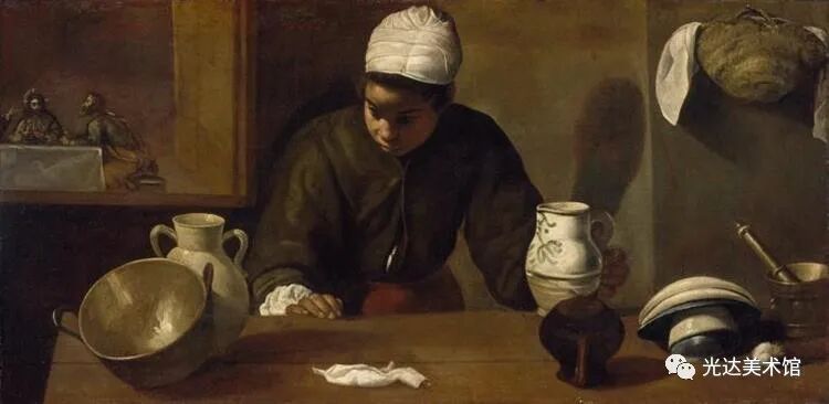 这不单纯是体裁上的形式选择,而是绘画在不得不思考两种截然相异的人生观念时真正的转捩点:要么是将所存在的重要方面作为独特的事件、伟大人物的戏剧以及对那种沉淀在叙述中的日复一日的凡俗生活的消解(disruptions)等来加以描绘;要么就极力主张,伟大的事件不过是昙花一现,只是现世生活表面的一种运动而已,其主要的成分由完全平凡和生活化的东西所构成,并源自可怜的现世的需求。与此同时,绘画也不得不对自身在世上的地位作两种完全相反的表述:一是作为高等的艺术(委拉斯凯兹是廷臣),二是作为纯粹的技艺(委拉斯凯兹是奴仆)。在委拉斯凯兹这位艺术家那儿,这样的两难性从来就不是与阶级的问题无关的。在《挂毯纺织女》中,雅典娜身旁的人物均穿着宫廷服装,阿拉喀涅所穿的却是织工的服装。在《耶稣基督在玛丽亚和玛撒的屋子里》中,耶稣基督优雅的姿态、圣母的美丽体态与厨房里的女人们的土里土气的粗壮等构成了对比——委拉斯凯兹正是将那种如何看待她们的注视特权交付给了观者。但是,阶级的问题,以及无论是高层次的现实还是趋大的描绘与排除在叙述、伟大性之外的诸阶级之间的格格不入等,在两件归在委拉斯凯兹名下的均题为《黑人女仆》的杰出作品中表现得最为明显不过了。