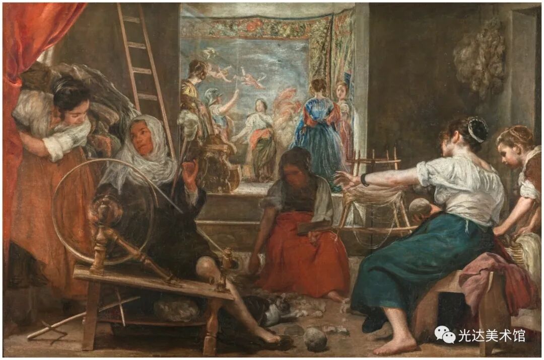 委拉斯凯兹所画的《耶稣基督在玛丽亚和玛撒的屋子里》也采用了像伊尔特森和乔基姆·彼克勒尔那样的双重结构,但是,它对绘画艺术自身可能涉及雅俗之间的对话有更为充分的反思。嵌入画中以表现耶稣基督、圣母和玛撒的场景可以解释成旁边房间里的场景——至此为止,与委拉斯凯兹的北欧前辈们没有什么区别;但是,它既可以解释为挂在两位女性身后墙上的镜中之像(在这里,人们必须将嵌入的场景中的人物看作是处在观者身后的位置上),也可以是当作画中之画。[9]后一种可能性使主题显得颇为错综复杂,亦使作品进入了画家在《国王之家》和《挂毯纺织女》中探索过的那种有关艺术的价值与指归的反思领域。镜子和画中之画所引入的是有关存在之中的严重分裂的观念;这种存在的一端是福音书中的主角们所处的那种受人称赞的层面,而另一端则是下层人命中注定的苦役人生。在《挂毯纺织女》中,雅典娜女神就像上面提到的耶稣基督、圣母和玛撒一样,占据了相似乃尔的非确定性空间,即介于现实与再现之间的空间。技艺女神受到了阿拉喀涅的挑战后与之比赛织毯,可是阿拉喀涅的编织技艺只是在人世间受到赞誉而已;雅典娜轻取其胜,而且为了惩罚阿拉喀涅的傲慢,将其变为一只蜘蛛。围绕委拉斯凯兹这幅画的意思争议不绝,我们在这里需要注意的是画家对诸种世界予以区分的兴趣——譬如神性的艺术与纯粹的技艺相对立,宫廷艺术举重若轻的辉煌与纺织轮无休止的劳作相对立。