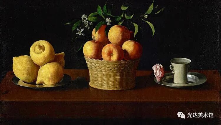 明暗对比法在苏尔瓦兰的作品中是举足轻重的,因为它在明暗交界处所建立的轮廓感使眼睛看到了具体的形态,而这些形态根本不是对应于手的把握的。用手指来感觉,杯子是一种连续的光滑,但是苏尔瓦兰笔下的强烈对比又使之变成相反的两个部分了。虽然柑橘令人想起特别强烈的肌理感——人们所熟悉的蜡质、小孔、密集的木髓的弹力等都得到了强调;但是,强烈的暗色调用光也为眼睛创造了陌生的、不可预见的形态。假如画面是一种柔和的用光,那么触觉就会占上风。明暗对比法从这些对象中引导出了一种戏剧化的客观性,而这只有对眼睛而言才有意义。这里包含了一种进展,即把凸现的视觉形式与同样饱满的触觉性的空间区分开来。对触感的巧妙攻击在醒目的构图中得以延伸,其中所有的一切都排列在一条无懈可击的线条上。通常,构图吸引眼睛进入图画要建立一种入画的途径(譬如近处的东西引向深处的东西)和一种围绕画面的循环途径(譬如从低到高再从高到低——文艺复兴盛期所偏爱的这种金字塔式的构图是对一种可看性的保证,是一种欢迎的标志)。但是,苏尔瓦兰的这些作品却并没有提供任何进入画面内部的途径,因为物体与观看位置的等距离反而是将观者推开了,使之与物品有一臂之隔。在眼睛与眼睛所要接触的形式之间横亘着一种任何事物都难以跨越的鸿沟。而这又是与触觉化空间的通常秩序相对立的;在触觉化空间里,一切都似乎是可以拿到、摸着和移动的。在这儿却什么也触摸不到,因为触摸会破坏画面上的情景。在盘子边沿上危若累卵的玫瑰花以及橘子上的花枝条使人打消了任何伸手去拿橘子或举起杯子呷一口的念头。正向的构图表明,画家对观者的存在是完全意识到的,而且构图的戏剧性也是有意把一切向观者推去。事实上,很难再想象出另一种更自觉地期望观者目光或者更用心地转向观者视线的构图了。不过,这种对观者存在的意识却又不伴随着任何欢迎或引导的迹象。因而,就有了一种无动于衷感和一种距离的约定感。一般地说,触觉化的空间是变动不定的:一切都是移来移去,挤在一起或随意拿动等,而静态的构图概念则是完全外在的。然而,这种静态恰恰是苏尔瓦兰笔下的东西所一直强调的。它们的摆放是计算过的,用马丁·索里亚(Martin Soria)的话来说,是一种毫厘无爽的制图术;极为微小的变动会打乱形式与形式之间的和谐比例,破坏它们无懈可击的排序。只有忘却触觉或动觉空间的概念,观者才能自然地把握画作。