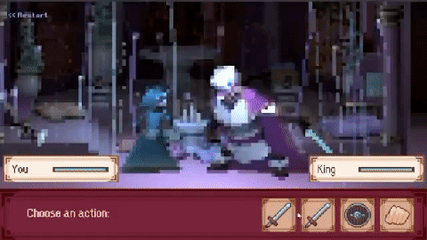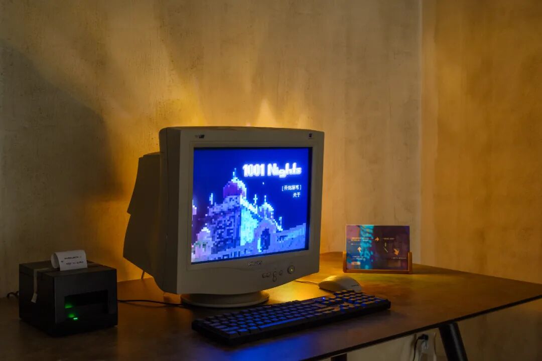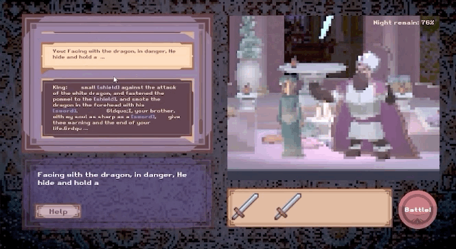 《一千零一夜》是孙羽茜做的一款游戏,由阿拉伯民间故事改编。玩家将扮演主角山鲁佐德,向国王讲故事,由 AI 驱动的国王会续写这个故事。当国王写的故事出现“剑”、“刀”或“盾”这些词时,它会掉落在玩家手中,成为玩家与国王决斗的武器。如果玩家打败国王,角色就会获得自由,这个合写的故事会被打印机打出,由玩家带走。国王 AI 由彩云小梦支持。
