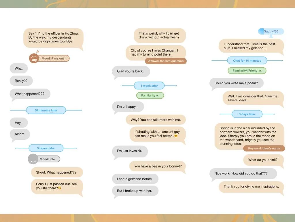 游戏有很多日常的情节和对话,让你了解游戏角色的性格和背景,做感情铺垫。可能在游戏里面过了十几天,就开始发生一些故事了,比如发现角色有某个秘密或者使命,让你去帮助他。这相当于,在游戏里模仿了一个真实世界的社交关系。
