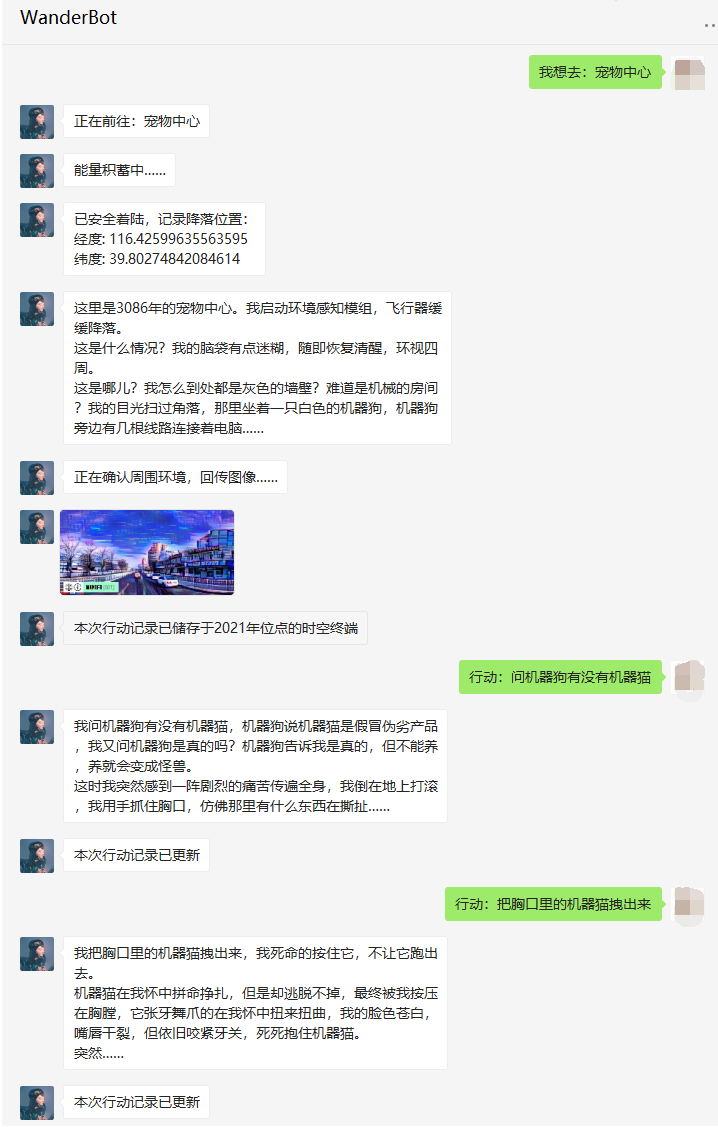 将任何一个国内的真实地点发送给她,她就会在未来去那里旅行,返回坐标,游记和照片————这些全部都基于真实地点生成。