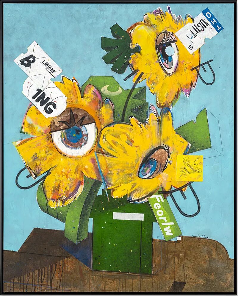 Lau:我有两个新系列的作品,分别是“Flowers”系列和“Soliloquy”系列。这两个系列都是这近两年在新冠疫情封锁期间构思而生的。我之前从未画过花,但我想为观众创造一些更令人振奋的东西,因为我知道这段日子对许多人来说是一段颇为艰难的时光。我在诠释花卉的主题时,不仅仅将它们视为植物,而是还将它们人性化,给它们画上了娃娃般的眼睛和表情,添上了一些来自街头和时尚美学的细节,为作品注入了一些超现实主义。