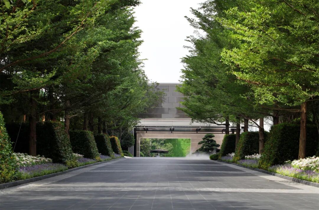 深圳万科·臻山府项目,建筑规划开启并完成了社区的礼序主体结构,以南北中轴线东西对称布局,社区入口门户内退,南北递进为四重空间,内部环路回绕映带,东西依次呈现三幅内庭景域。景观设计由此规划结构衍生:以南北轴线为干,外畅内幽,从公共空间过渡至私属领域,礼序分明,一点透视的对称秩序传承了大宅的登堂入室气质;以环路为枝,外实内虚,从近人尺度的空间庇护导引视野瞭望风景,长卷舒展,步移景随的感受陪伴漫步家园的历程,并由此展开生活的图景。