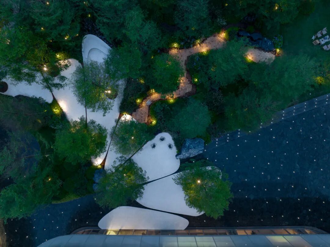 具体设计方法上,我们以一个统一的手法围合场域空间,屏蔽嘈杂的外部环境,形成内向风景、外展界面的布局。由此,内部森系花境的生活沉浸式风景可以纯粹地浮现。