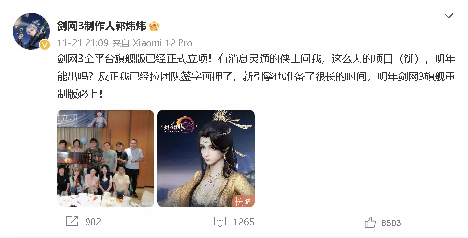 在今年的周年庆发布会上,郭炜炜宣布《剑网3》即将登陆全平台,支持安卓、iOS、PC三端数据互通,这意味着它将成为第一款原生支持PC与移动端数据互通的3DMMORPG。在上个月,郭炜炜又在微博上更新了动态,表示明年就会带来这次升级。