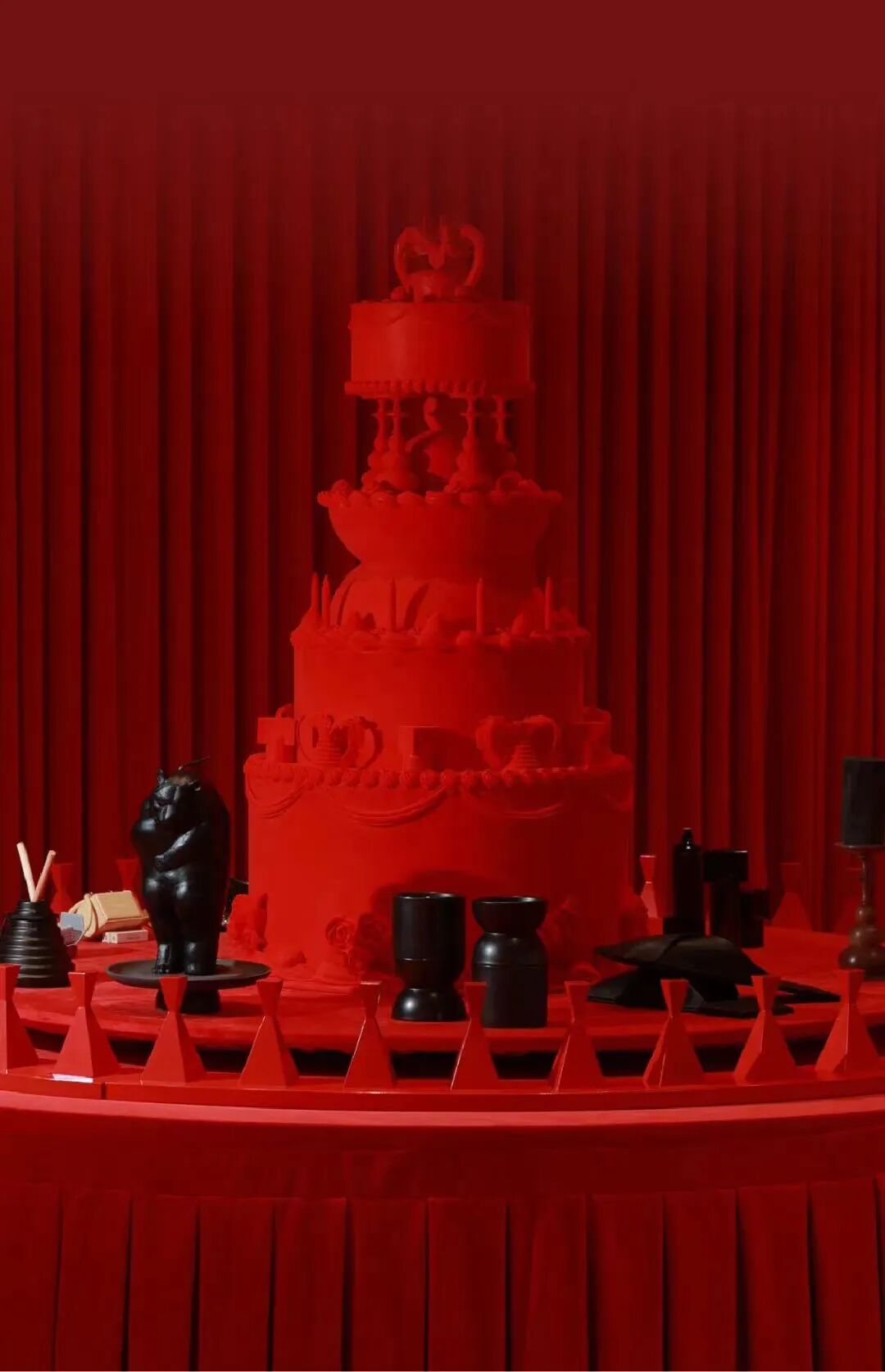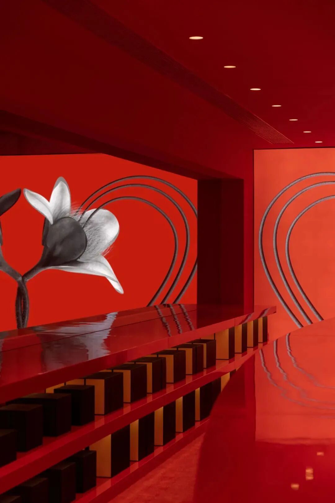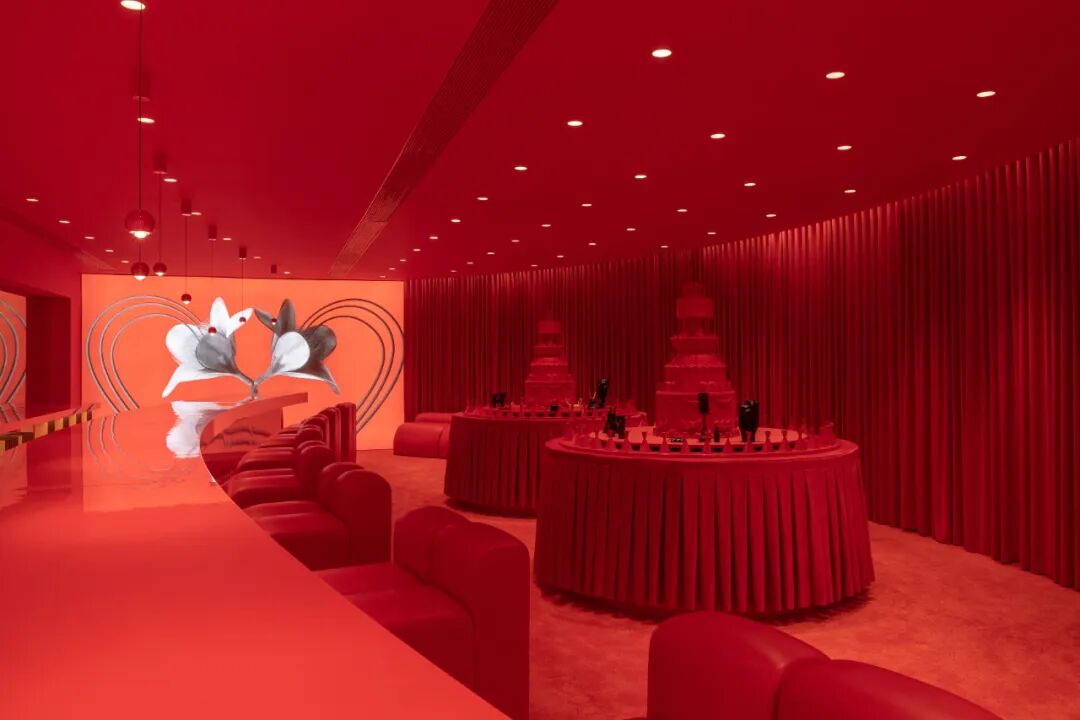 在这里,能看见摆满产品的红色大圆桌与置于其上的全红大尺寸蛋糕装置、巨大的试香桌台,以及空间大屏幕上的黑色双生花朵。同时在视觉之外,人的嗅觉感官也在获取满足,这是一个黑色、红色与气味相互夸张碰撞的实验场所。