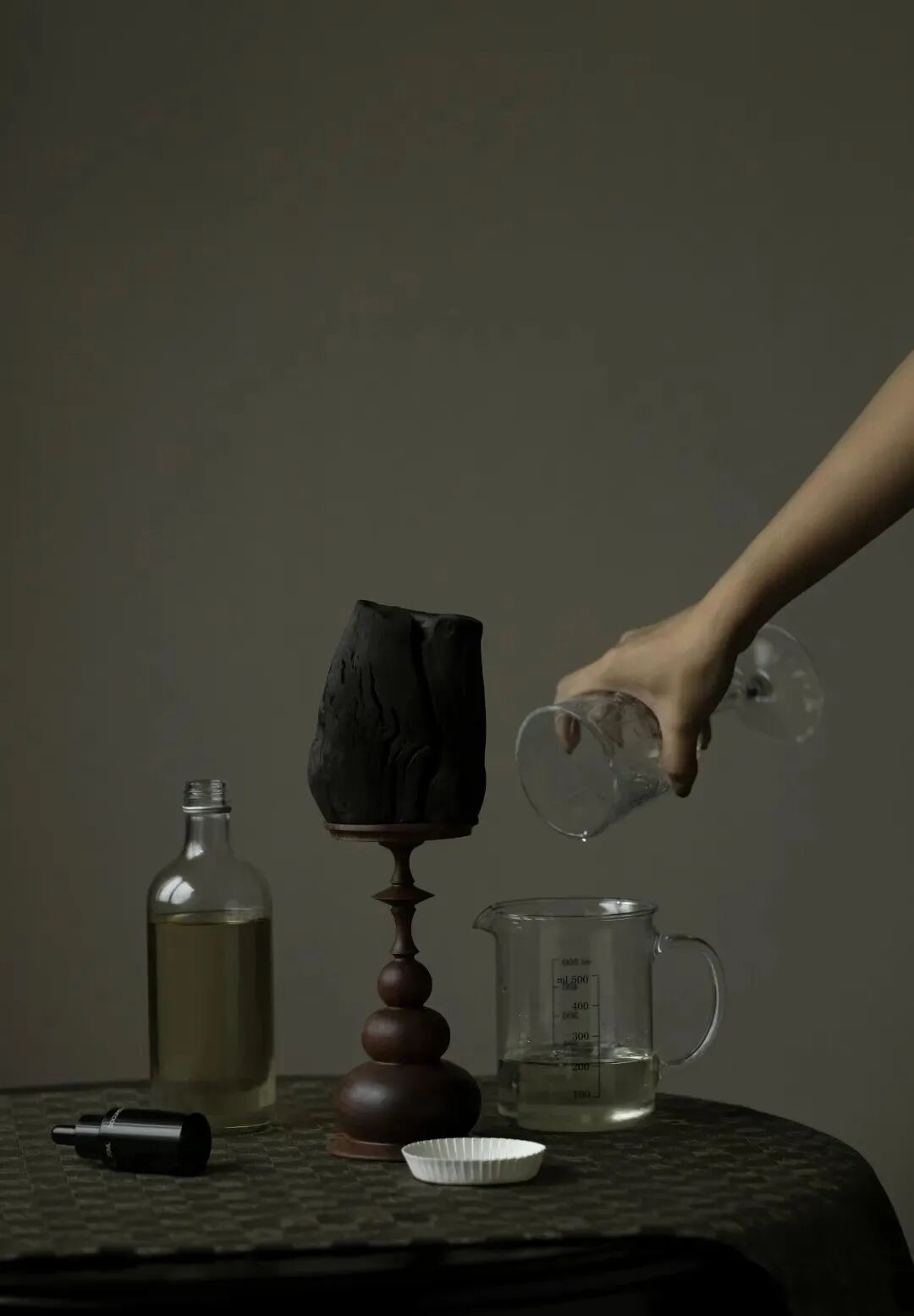 置于囍堂空间中央的喜宴式的桌席,摆放着以婚礼为灵感的蛋糕装置,并以自动式转盘如婚宴肴馔般呈现闻献招牌产品系列,每一道都是精心创制。四周环绕酒杯式的试香器具,更添几分轻松与趣味,试香器与台面相碰所形成声音,也仿若置身喜宴仪式的觥筹交错之中。
