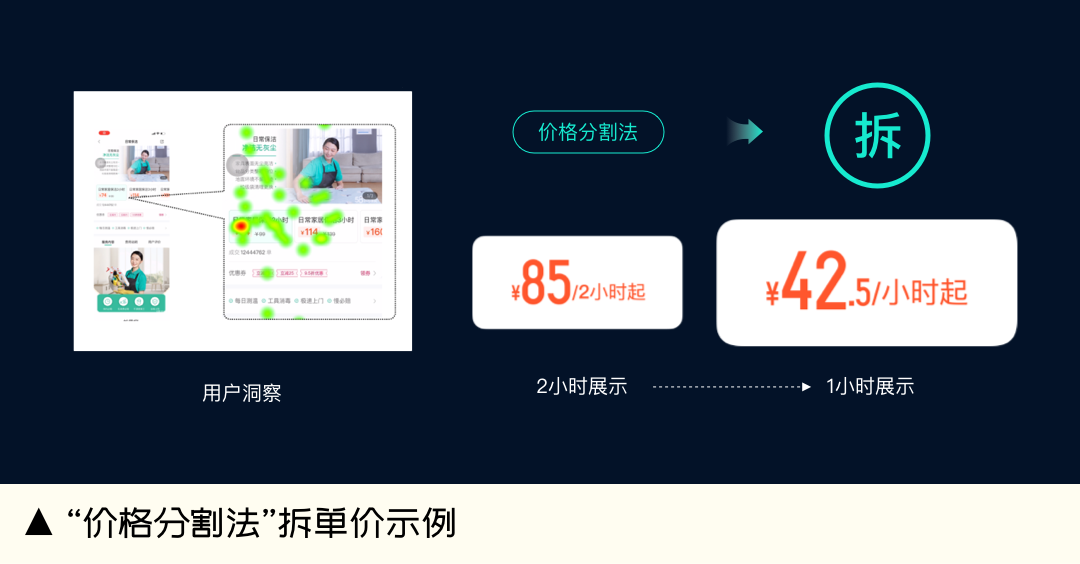 业务之前展示价格为2小时起,我们利用“黄金分割法”对价格进行分割,拆成单价以每小时起来唤醒用户“求廉”的动机。