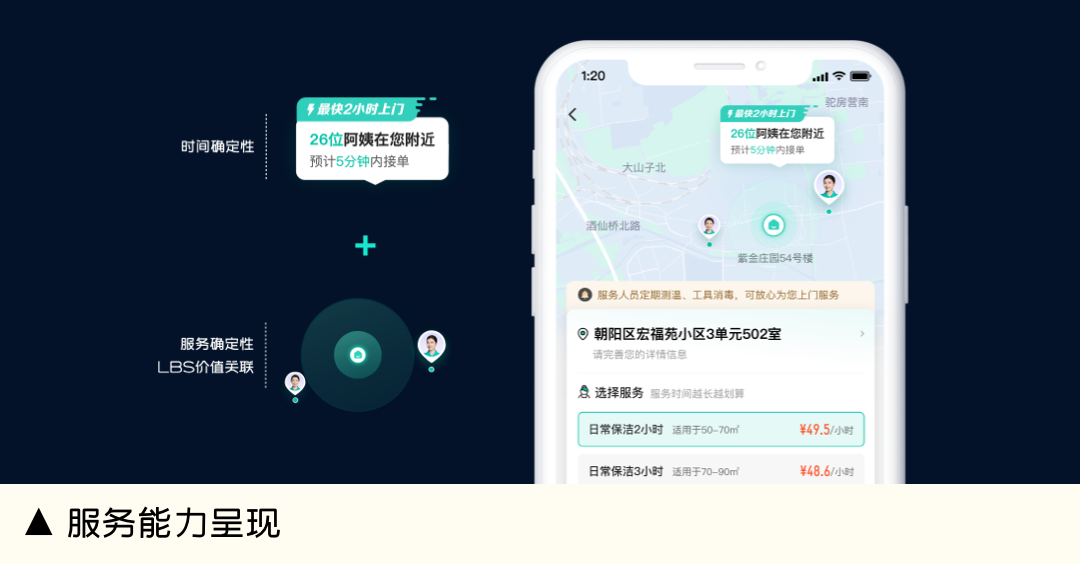 一大波暖心服务就在你家附近,最快2小时就可以上门。这就是将服务要素进行数字化展示的意义-为用户带来确定性。