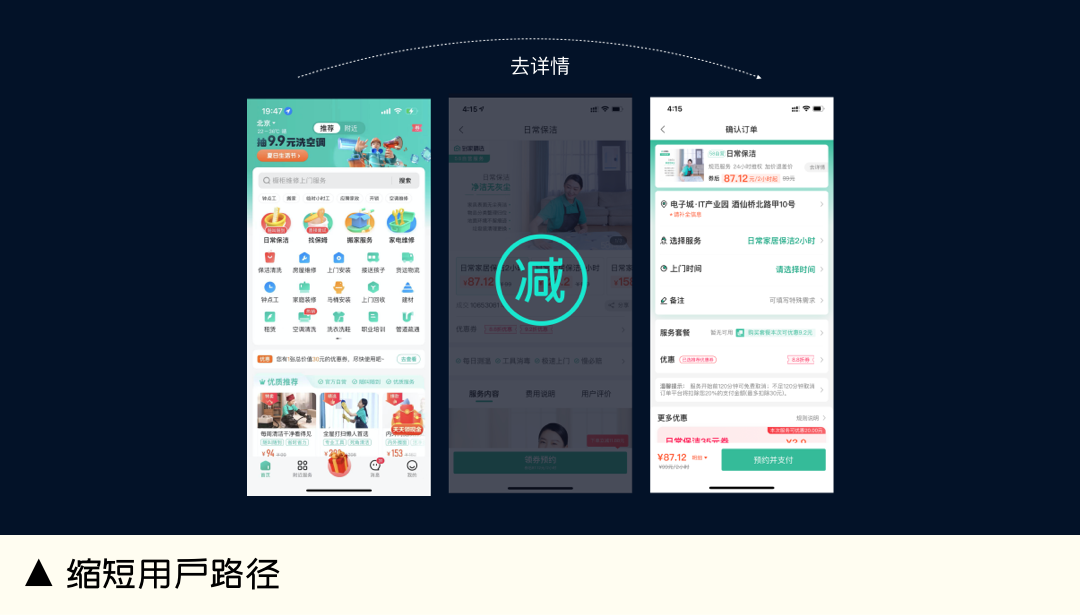 以到家精选为例:我们在做老用户下单路径的时候,在老用户这个场景中如何帮助老用户快速完成下单是一直思考的,所以为了减少老用户在下单过程中的损耗,直接把详情页去掉,减少用户操作,老用户直接从入口就可以到达订单页面从而快速完成下单。所以最好的方法,就是持续地用“能力链”来分析,找到问题所在,再针对问题重新设计。