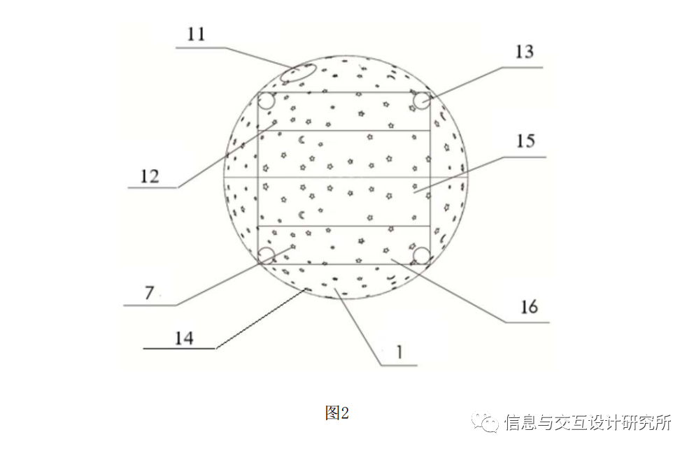 LED灯13置于球体表面的孔洞8中,光线通过孔洞8散发,投射到地面及墙壁上,LED 灯13颜色设置为红橙黄绿蓝靛紫七种颜色,七种颜色按顺序切换闪烁,每种颜色持续2s。家长可以通过调整灯光装置,作为小夜灯使用。