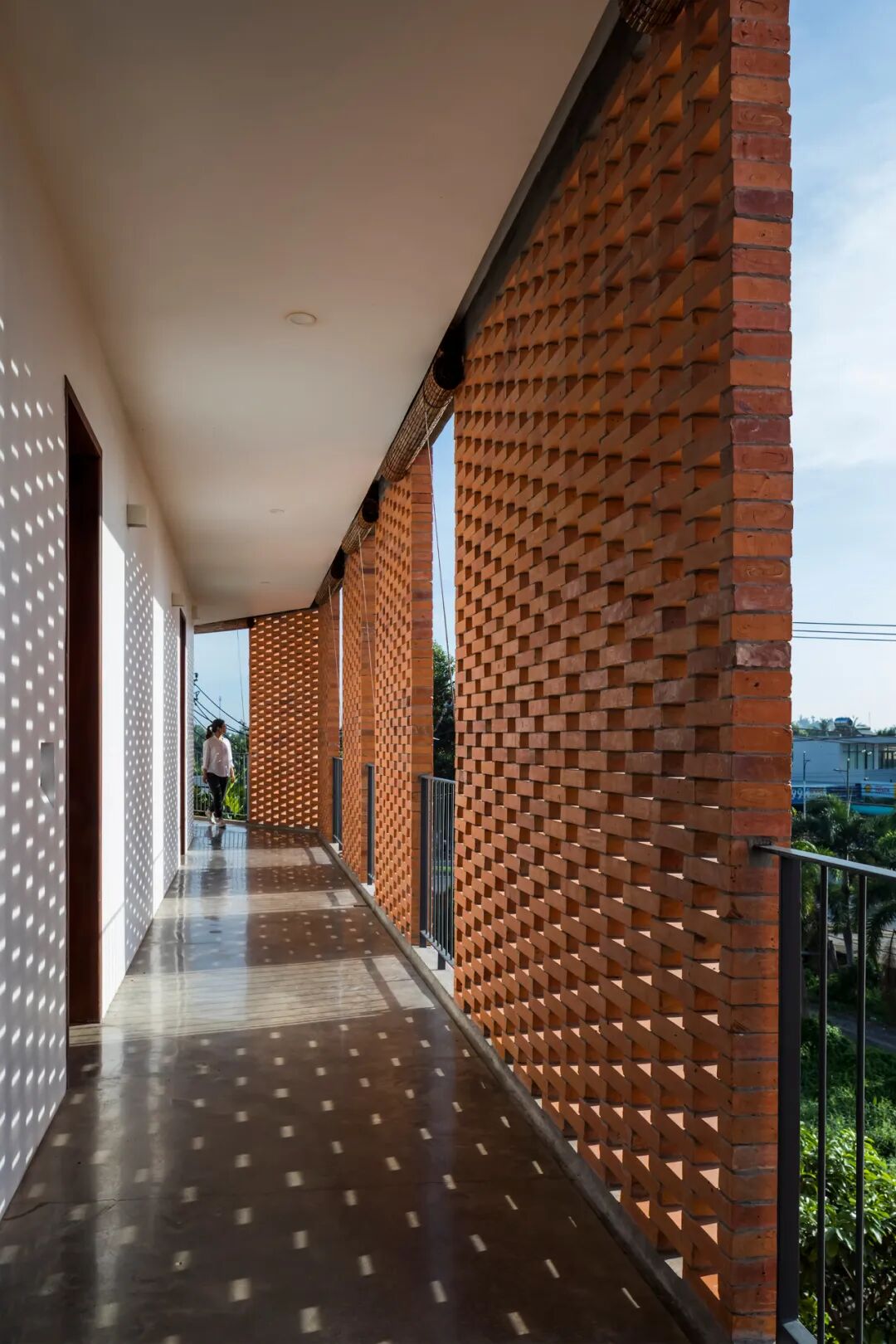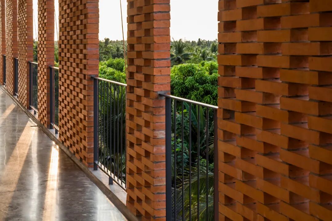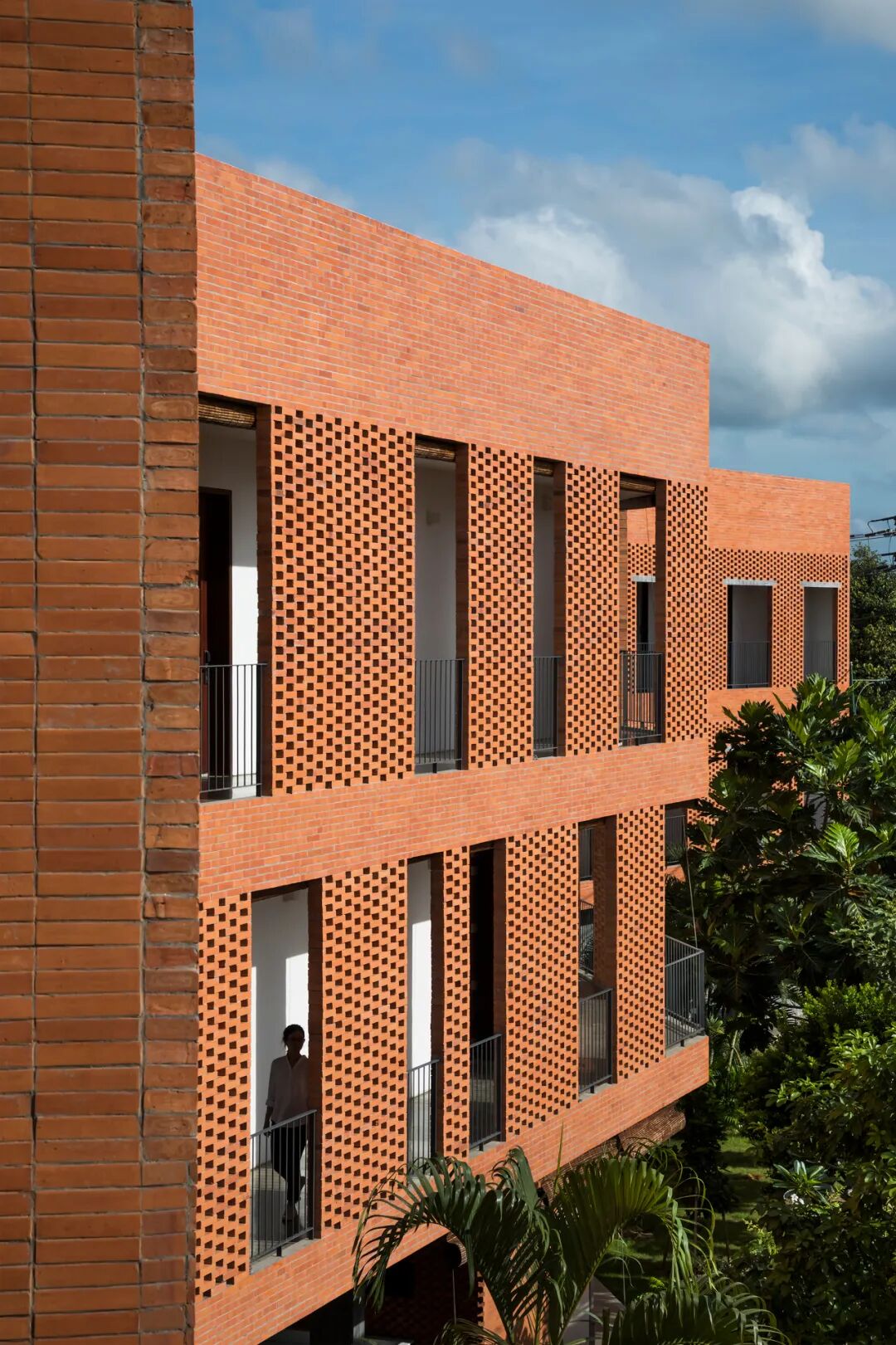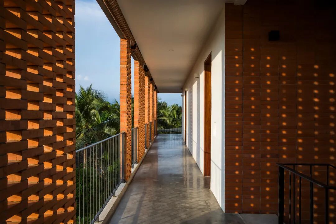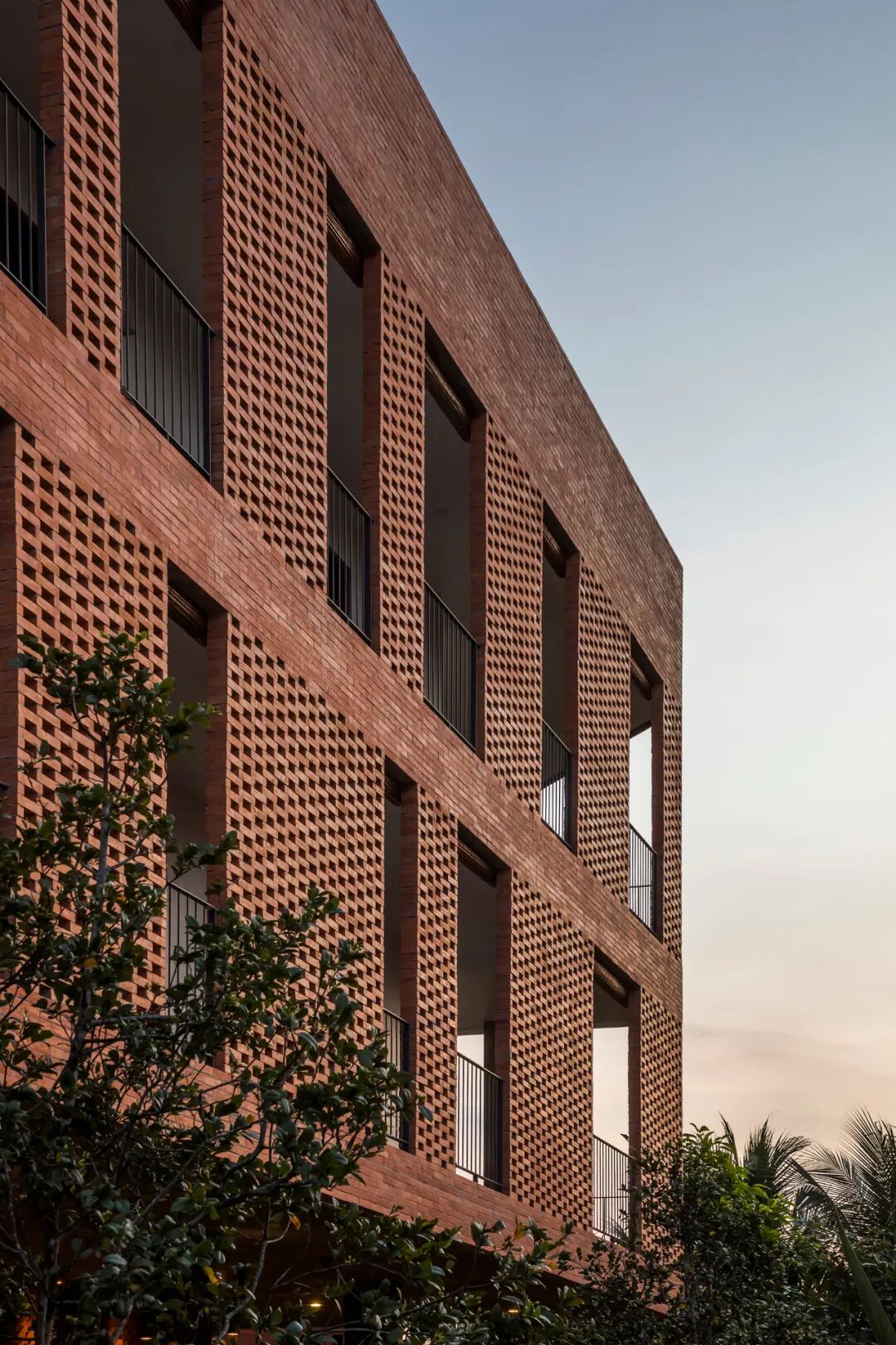兵马俑砖:该地区生产的手工材料。在湄公河三角洲地区,许多工厂都生产无釉砖;这些种类的手工砖在郊区的一家砖厂烧制,用于本项目的外墙。每块砖都是手工制作的,所以颜色并不均匀,这就形成了大规模现成产品所没有的温暖外观。特别是,构成酒店外墙的二楼和三楼的走廊和客房的外墙,都有砖墙的图案,砖墙之间有空隙,作为遮阳和屏风,让令人印象深刻的光线照射进来,随着时间的推移而变化。