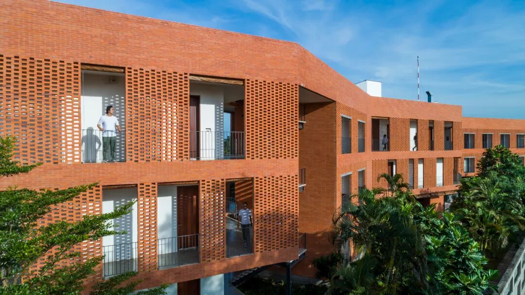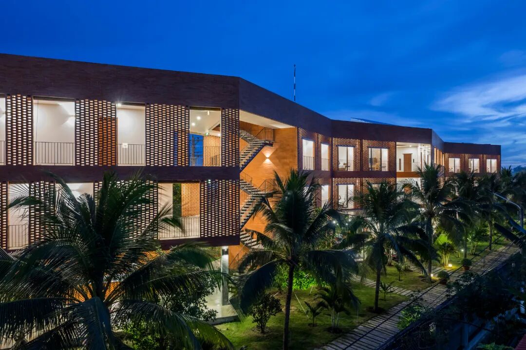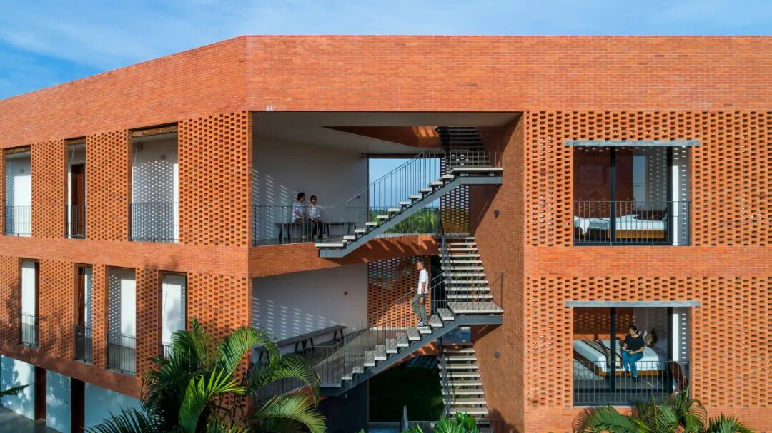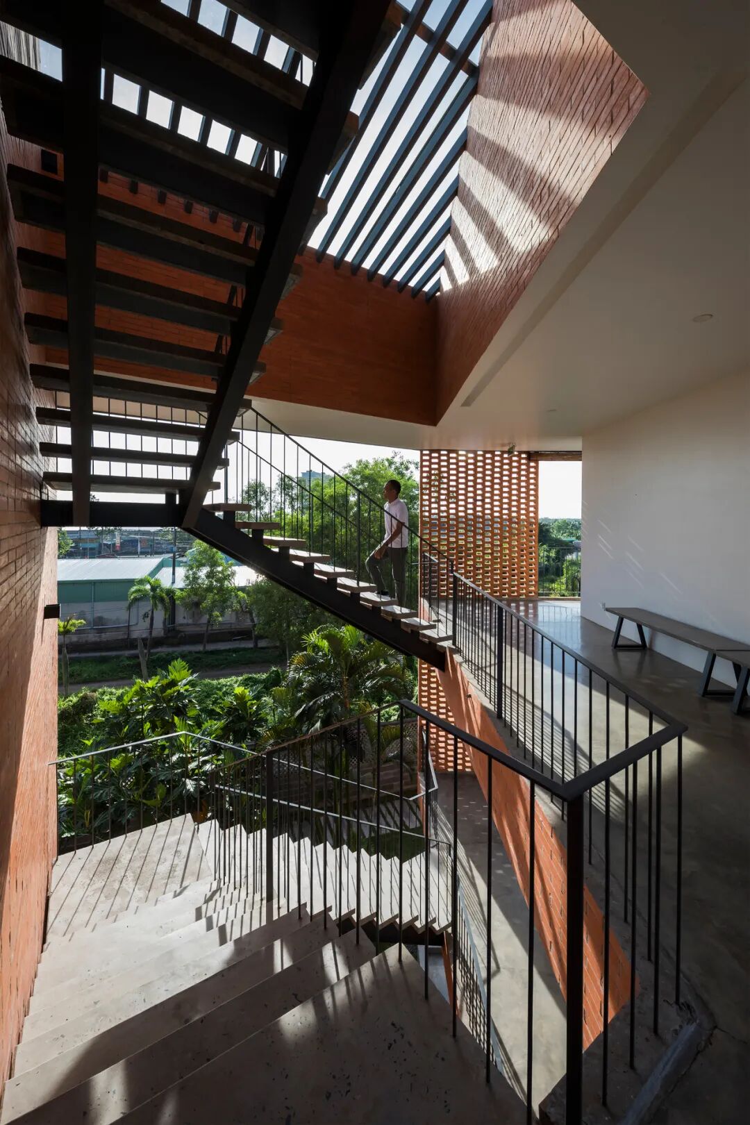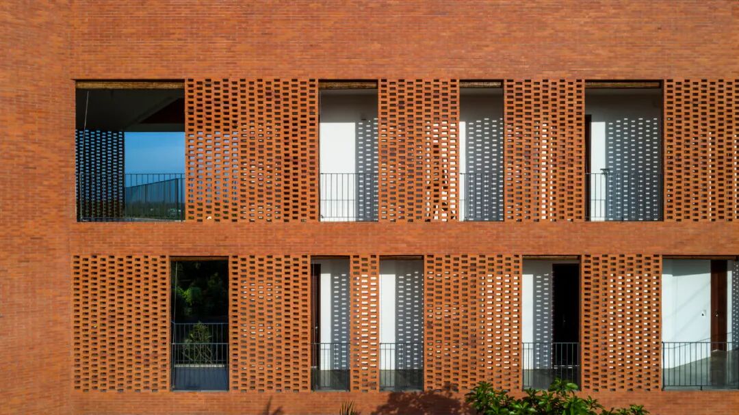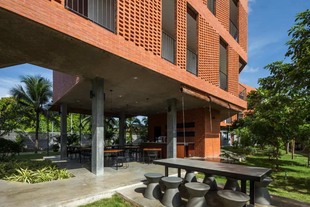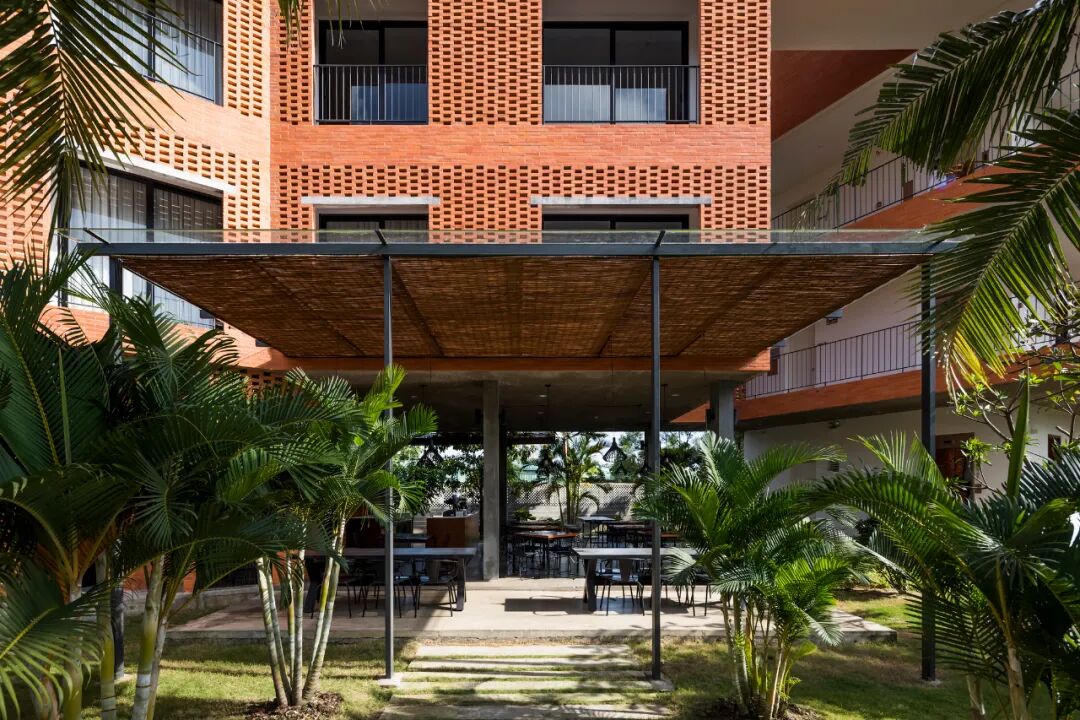 兵马俑砖:该地区生产的手工材料。在湄公河三角洲地区,许多工厂都生产无釉砖;这些种类的手工砖在郊区的一家砖厂烧制,用于本项目的外墙。每块砖都是手工制作的,所以颜色并不均匀,这就形成了大规模现成产品所没有的温暖外观。特别是,构成酒店外墙的二楼和三楼的走廊和客房的外墙,都有砖墙的图案,砖墙之间有空隙,作为遮阳和屏风,让令人印象深刻的光线照射进来,随着时间的推移而变化。