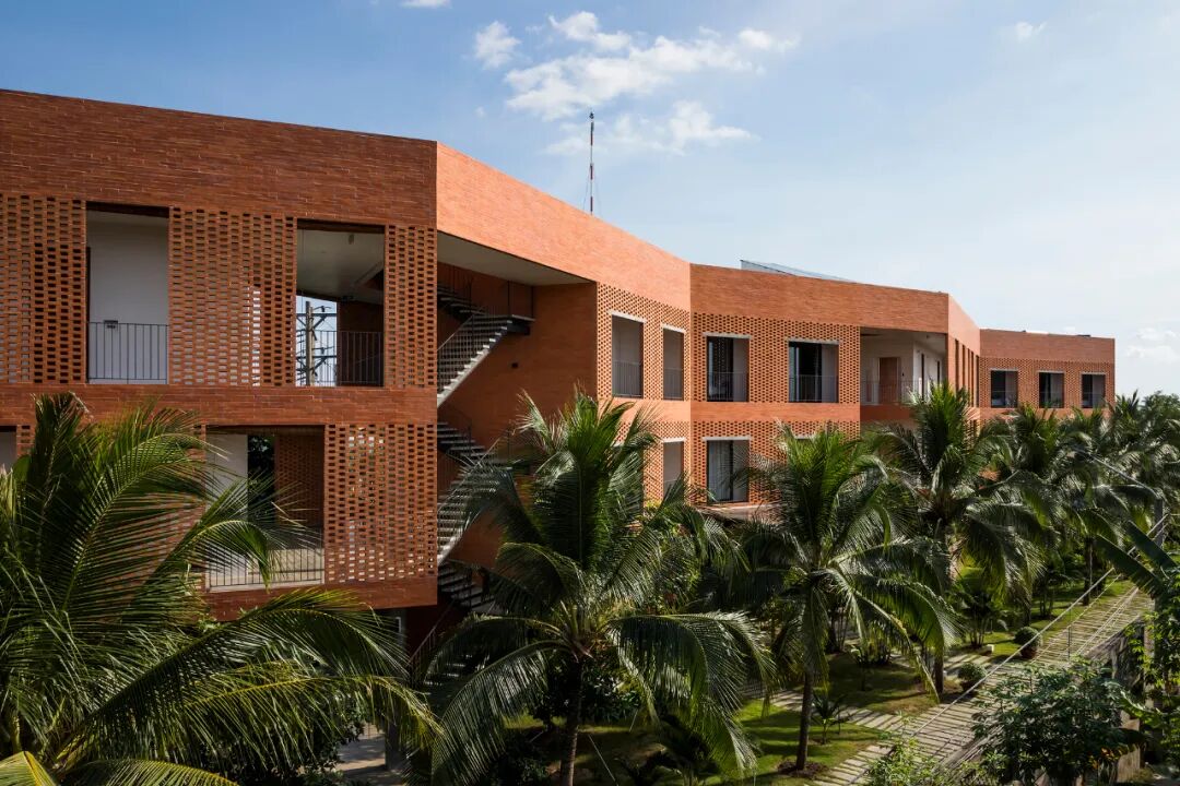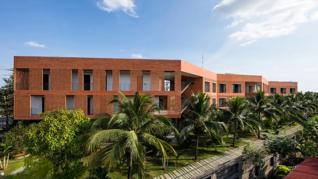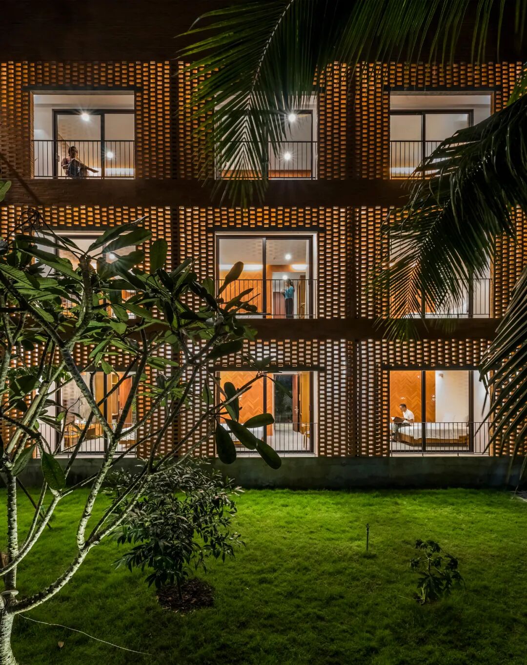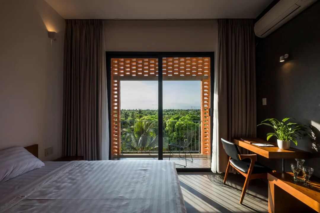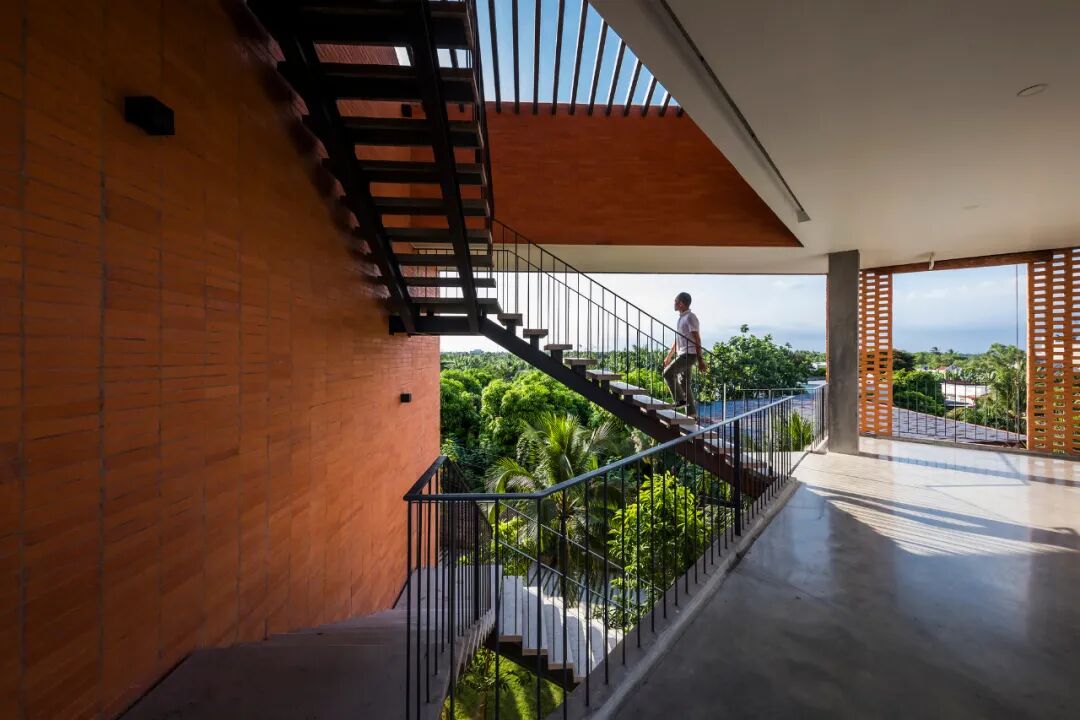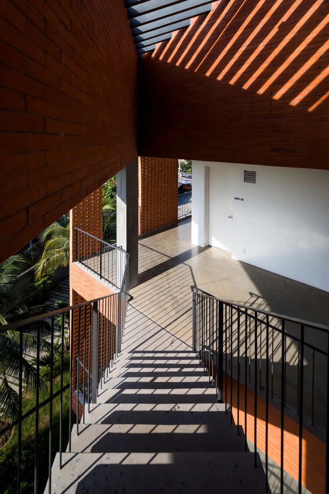 兵马俑砖:该地区生产的手工材料。在湄公河三角洲地区,许多工厂都生产无釉砖;这些种类的手工砖在郊区的一家砖厂烧制,用于本项目的外墙。每块砖都是手工制作的,所以颜色并不均匀,这就形成了大规模现成产品所没有的温暖外观。特别是,构成酒店外墙的二楼和三楼的走廊和客房的外墙,都有砖墙的图案,砖墙之间有空隙,作为遮阳和屏风,让令人印象深刻的光线照射进来,随着时间的推移而变化。