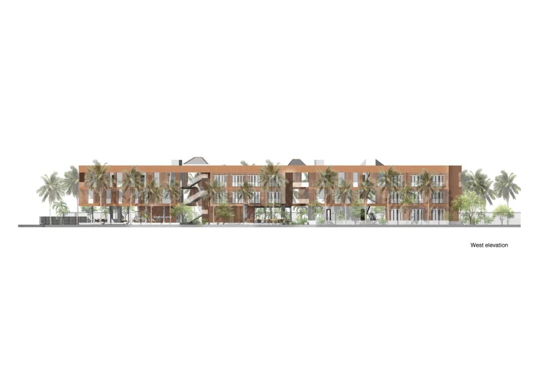 建筑物的曲折和凹陷部分是一个种植着棕榈树和其他热带树木的花园,当游客沿着一楼走去时,每个角落都会出现一个绿色的花园,同时还有入口、餐厅和其他开放设计的公共空间。建筑师打算通过高层的走廊和楼梯安排来获得景观和壮丽的椰林的重要视野。