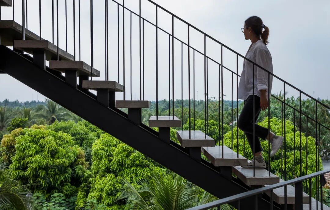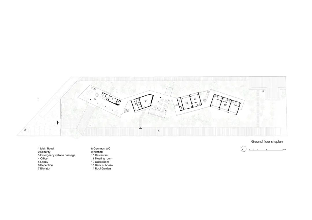 感受湄公河三角洲丰富的自然环境的序列。由于场地的形状极其狭长,这栋建筑有必要设置一条走廊。这意味着客人必须从街边的入口走很长的距离才能到达酒店的后面。因此,我们设计的客房不在一条直线上,而是与场地有不同的角度,这样整个建筑就会有一个之字形。该结构由五组客房和一条走廊相沿组成。走廊和客房布局的位置在交界处进行了切换。这种安排也产生了一个更好的周边视野。这创造了一个不只是令人厌烦的长走廊的序列,而是一个多样化和迂回的序列,使游客能够享受各种场景。
