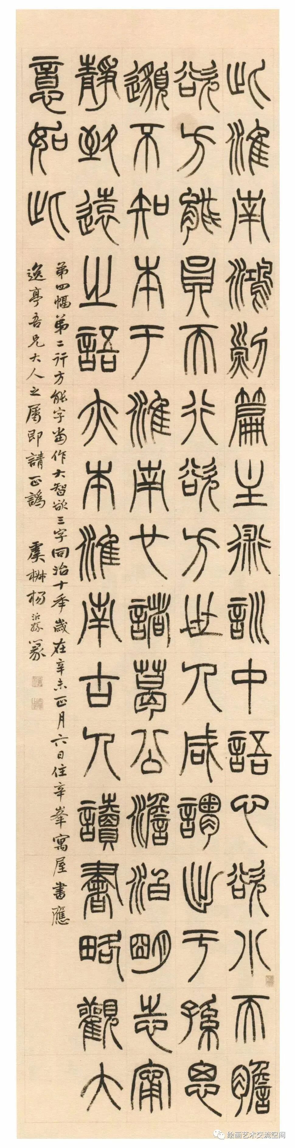 《淮南子主术训》四屏作于1871年,每屏幅近八尺,共三百余篆字,字幅大而运笔精。