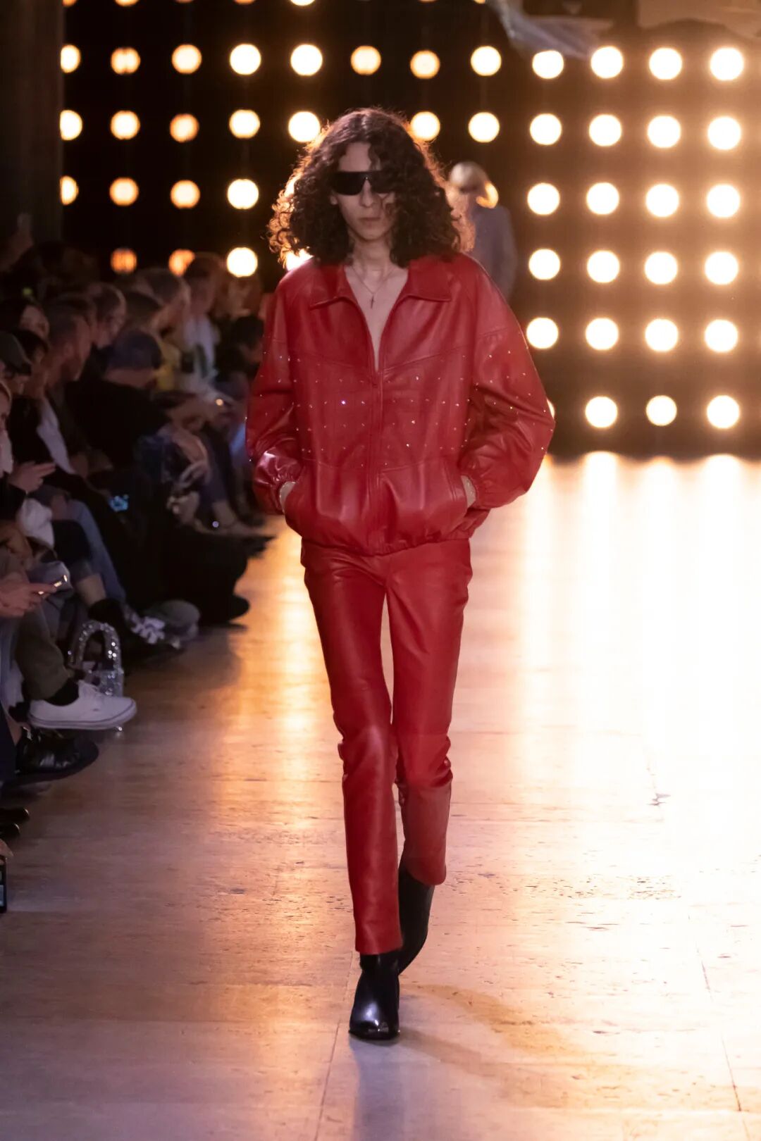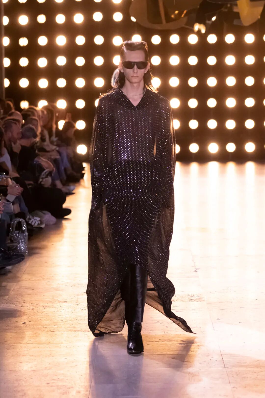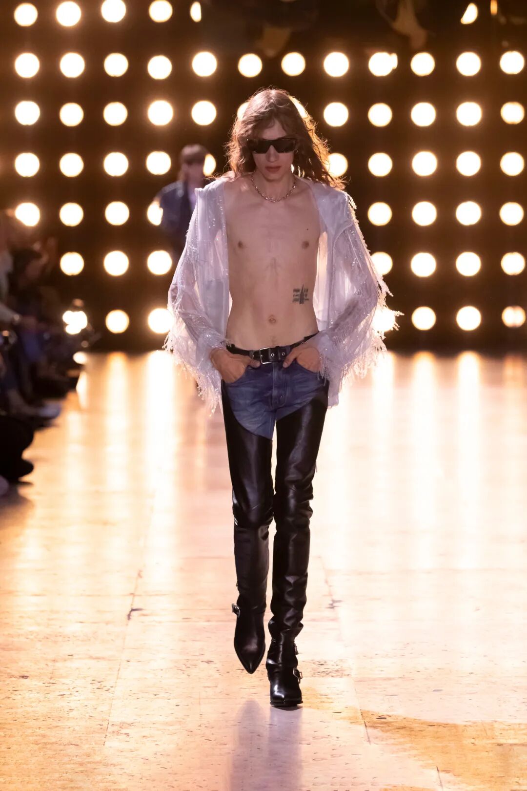 我们可以看到T台上的模特们穿着由水晶、钉珠装饰的皮衣和西装,搭配喇叭廓形的牛仔长裤和尖头皮靴,摇滚范十足。