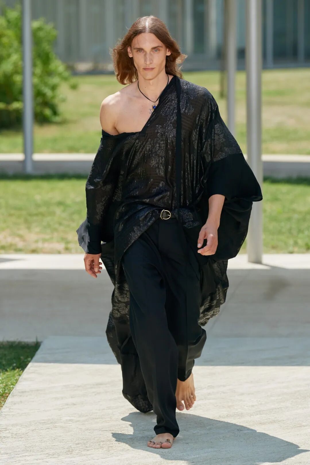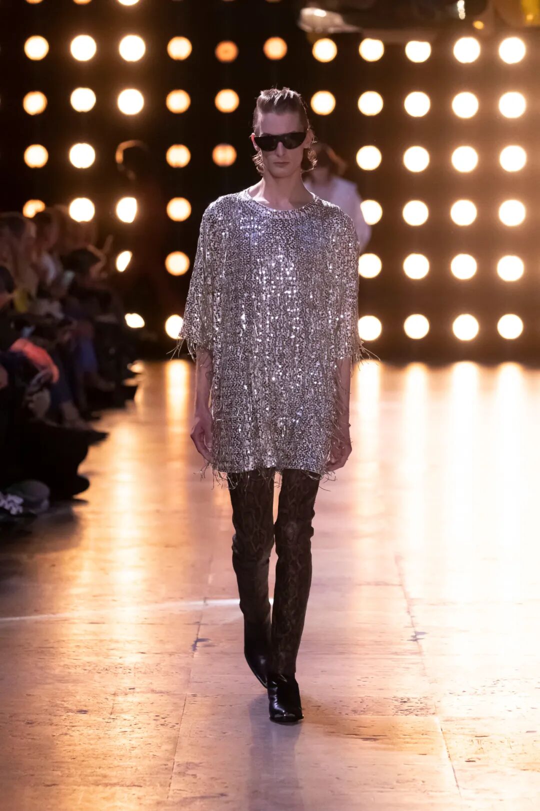 除此之外,这场大秀的有趣并不仅限于此。秀场中不仅包含了大量的露腰上衣和男式超短裤造型,男模们还穿上了各式裙子走上T台进行开场。