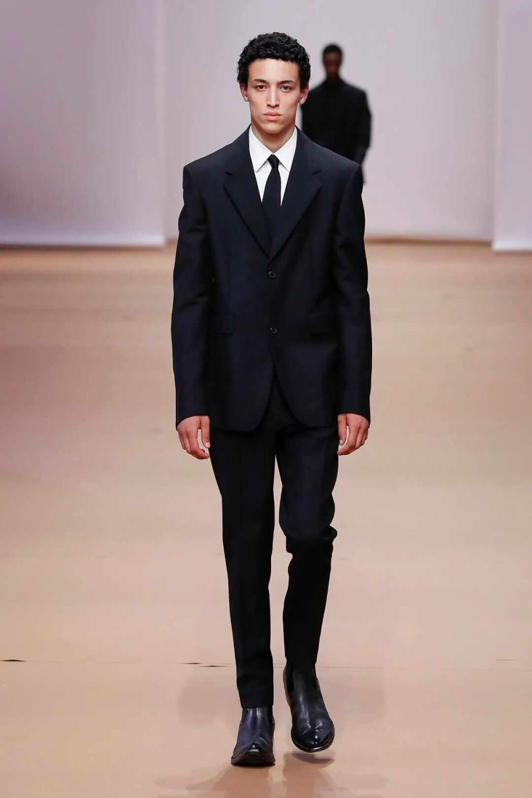 与此同时,Hedi Slimane继续秉持自己一贯的风格,通过利落的肩线设计,让每件服饰拥有宽肩窄腰的版型,并且贴合腿部曲线的裤型剪裁,完美展现模特们腿长优势。