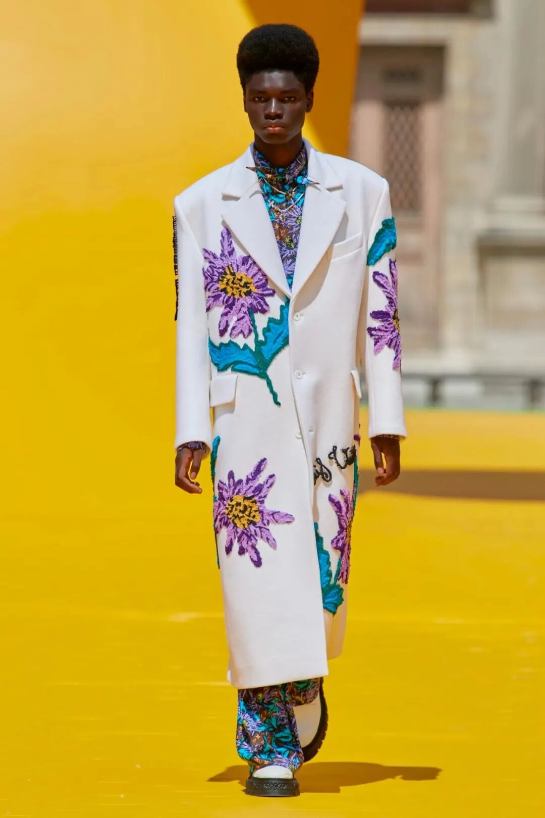 花卉、叶子是该系列主要的装饰元素,贴布绣、印花、刺绣、提花等艺术风装饰形式融入到设计中,潮流感及艺术气息十足。而有关Virgil Abloh的Louis Vuitton秀场上也少不了性别模糊的设计——「男士也拥有穿裙子的权利 」。
