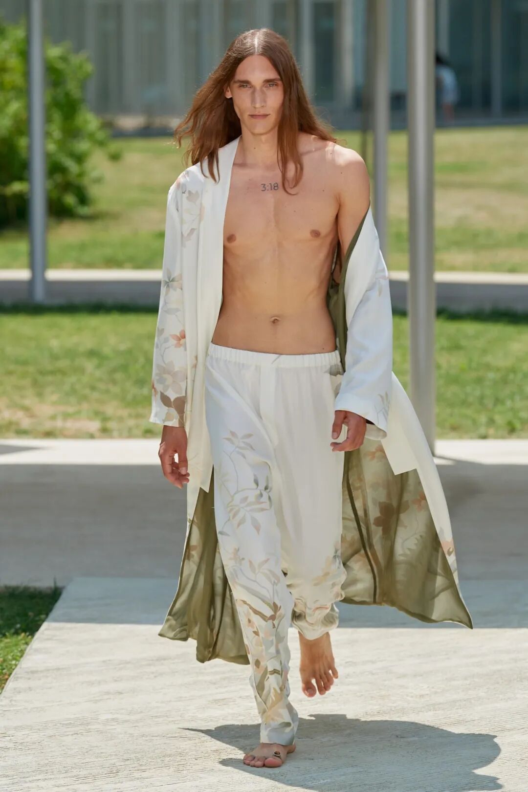大量赤裸的胸襟和解开的衬衫勾勒了美好画面。蕾丝和穿孔毛衣不仅诉说夏日的轻盈,也诉说着诱惑的欲望;精致的日本花卉印花,变成衬衫,从白色开始探索夏季色调,最后以黑色结束。狂野又性感的一季男装,满是夏日的风情。