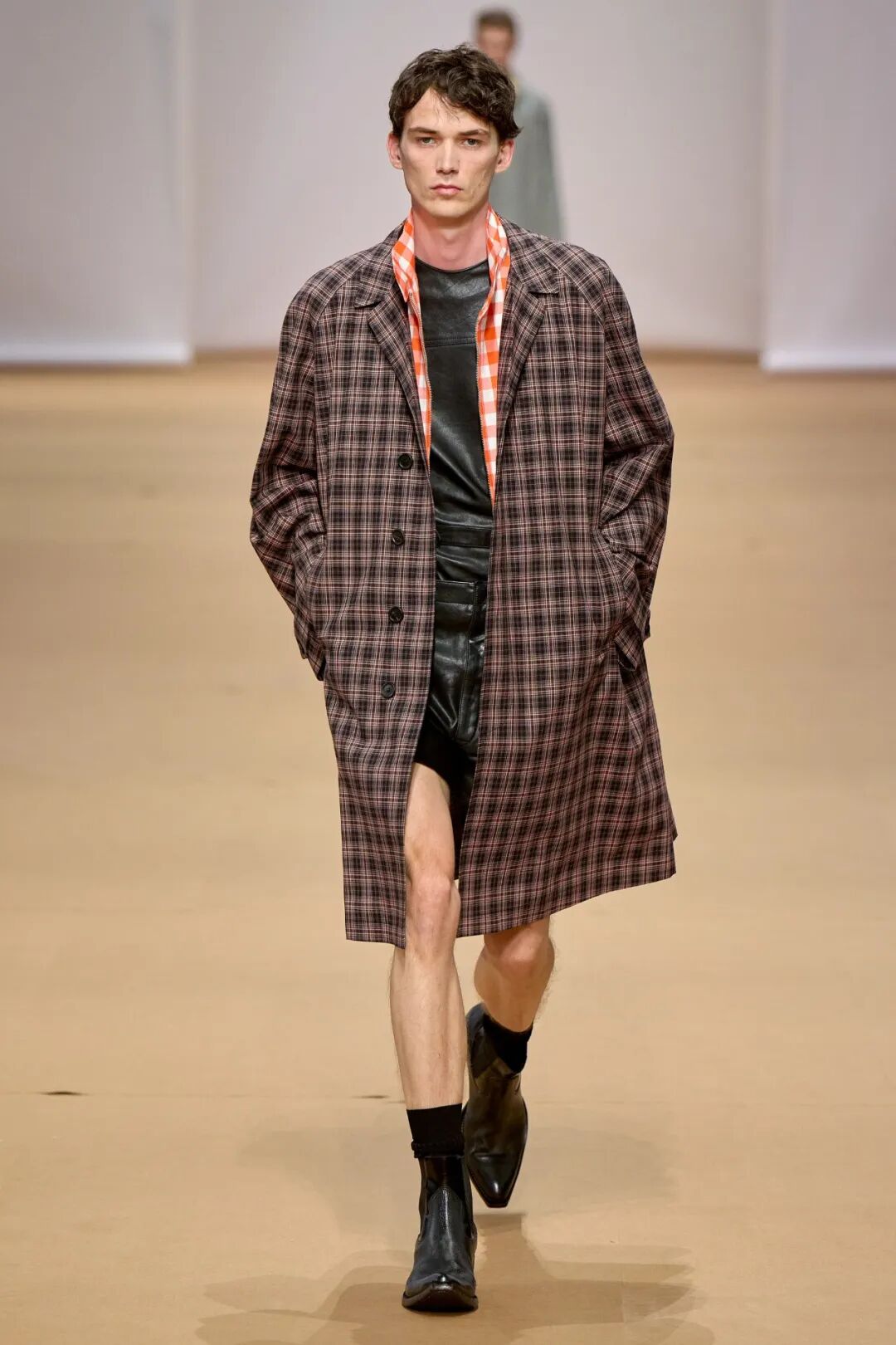 模特们穿着修身的羊毛西装和价格数千美元的皮革短裤在白纸搭建的空间里大步走出,形成强烈的反差。