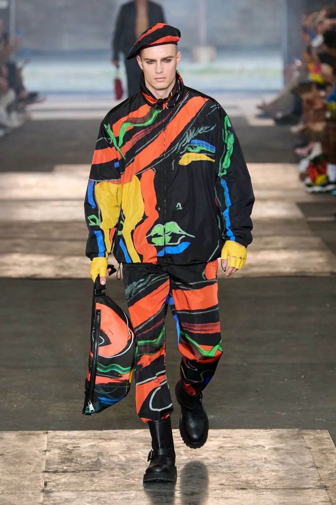这一次,Jeremy Scott再一次将涂鸦印花带到男装设计之中,用油画的笔触将衣服轮廓在面料上勾勒出来,而我们在本季服饰上所看到的人脸画,也都是来自Tony Viramontes的作品。Jeremy Scott将他的画作作为主线穿插在整个系列中,再配合上品牌一贯缤纷的色彩,以及宽松的廓形和利落的剪裁,让本季趣味横生之外,还颇有艺术氛围。