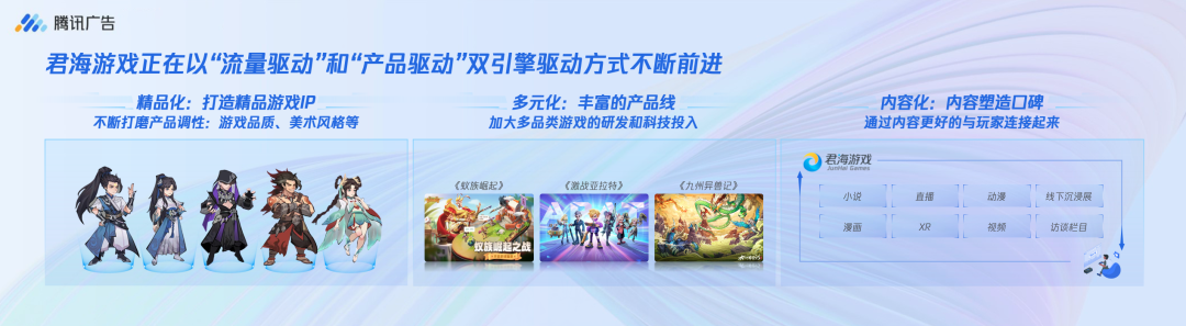 这也使得君海游戏更敢于押注更长线的内容运作:在未来五年尽可能打造出自己的IP。对他们来说,腾讯广告带来的经验和资源,就是最好的引导,能让他们可以知道每个节点该做什么、怎么运作、制作怎样的内容。