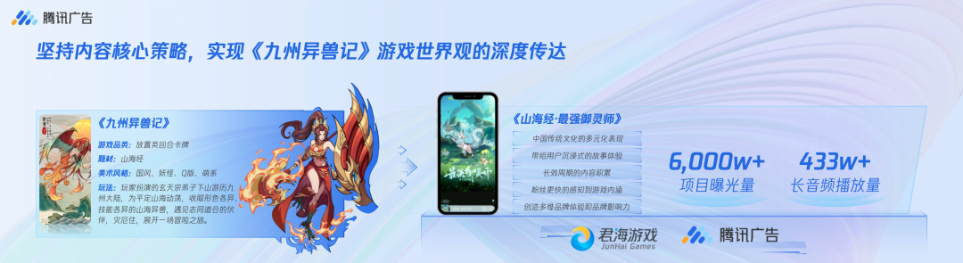 上周五的文章中,葡萄君聊到在腾讯广告主办的2022游戏广告生态大会上观察到的一个特殊案例:腾讯广告与君海游戏针对《九州异兽记》合作的内容营销打法,不仅拿到了6000万以上的曝光量,还反哺了广告投放,顺利将成本压低至市场水平之下。