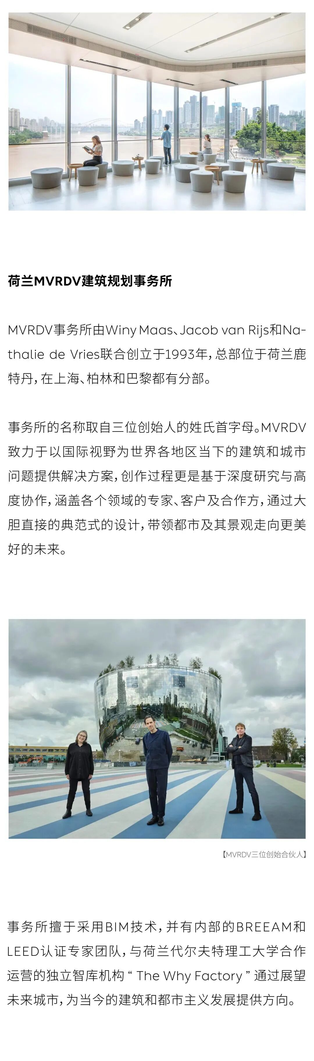 MVRDV建筑规划事务所由Winy Maas、Jacob van Rijs和Nathalie de Vries创立于荷兰鹿特丹,致力于为当代的建筑和都市问题提供解决方案。MVRDV的创作基于深度研究与高度协作,各领域的专家、客户及利益相关方从项目初期一直参与设计的全过程。直率而真诚的建筑、都市规划、研究和装置作品堪称典范,让城市和景观朝向更美好的未来发展。