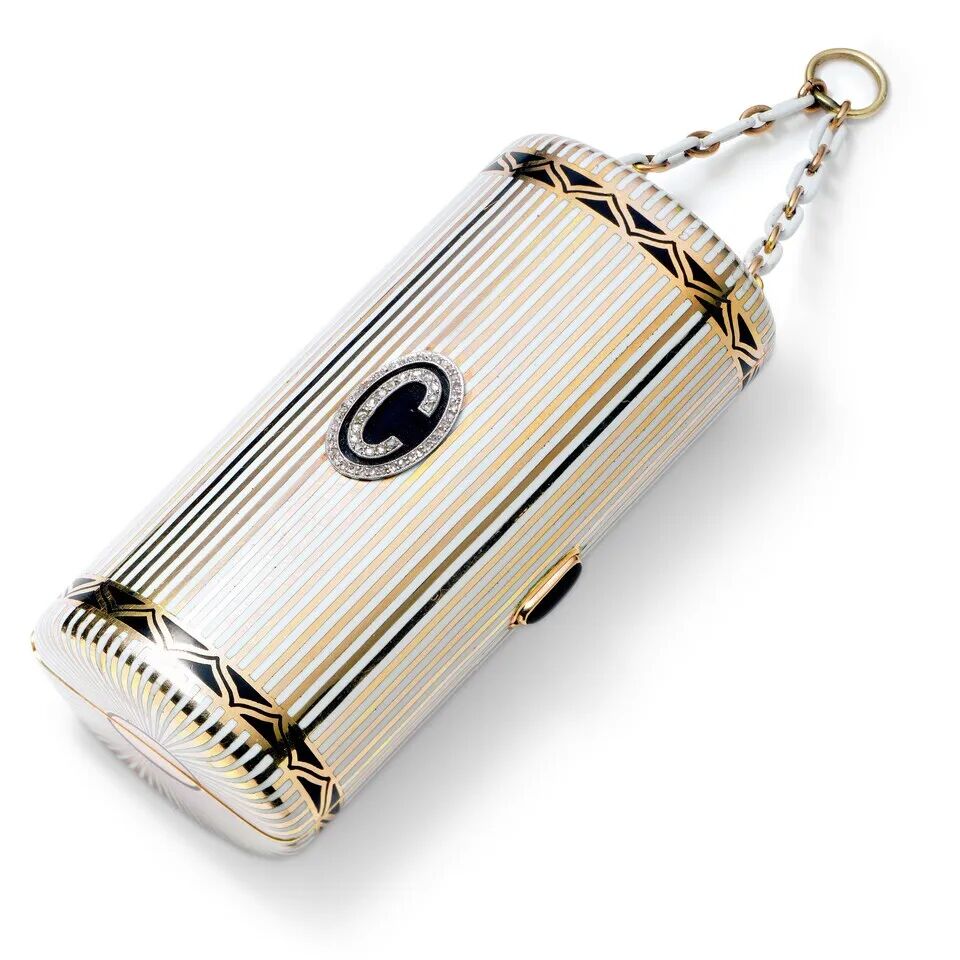 上图这款梳妆盒造型的晚宴包,是威斯敏斯特公爵送给情人香奈儿女士(就是上面的香奈儿)的礼物,由卡地亚制作于1924年。设计师在接受委托后,结合香奈儿女士的气质,将包包的金属表面勾勒出白色珐琅条纹,用钻石镶嵌出字母C(香奈儿女士名字首字母),和底部的黑色形成鲜明的对比。