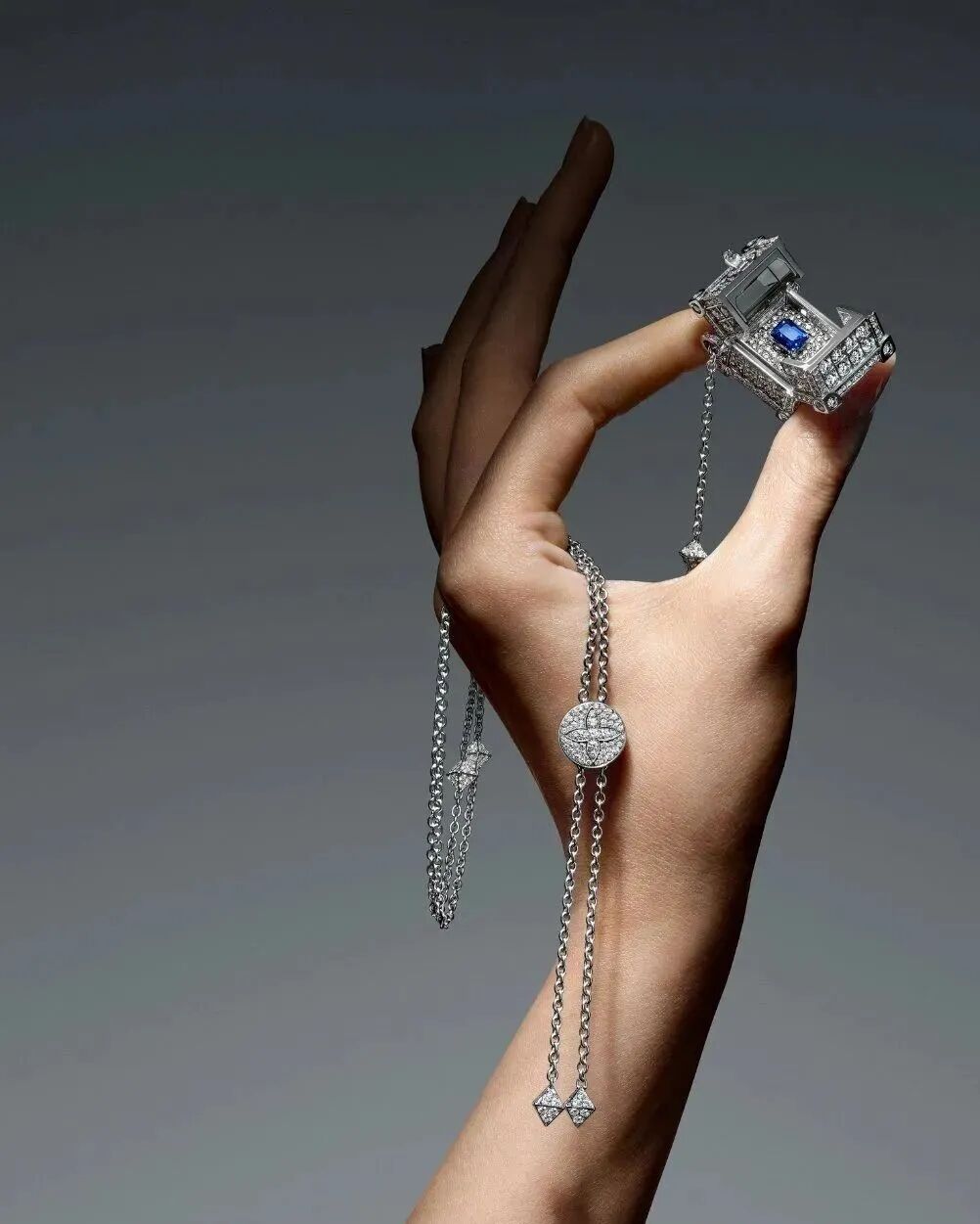 将项链上行李箱造型的吊坠打开后,你会发现内部镶嵌着的钻石中间,簇拥着一颗蓝宝石。这个设计让整件作品的气息忽然神秘起来,犹如在充满了冒险和未知的旅途中,携带着一只不为人知却暗藏着宝石的行李箱。