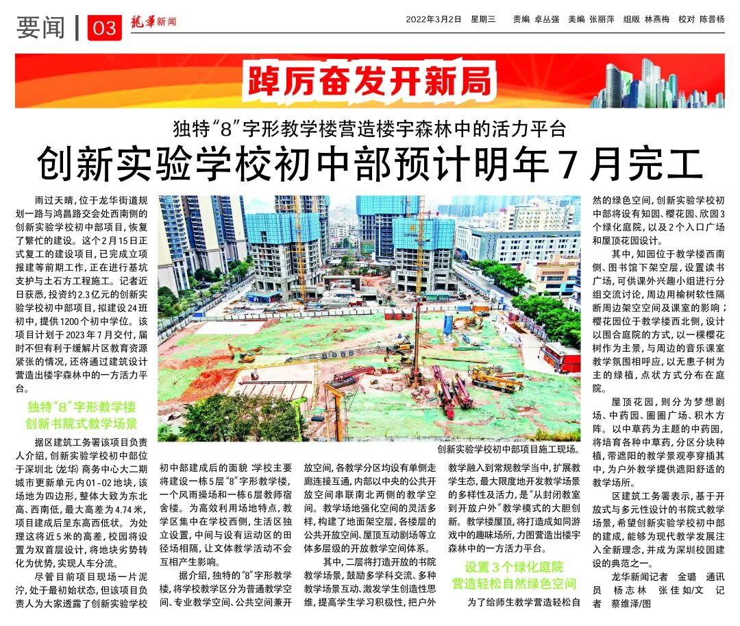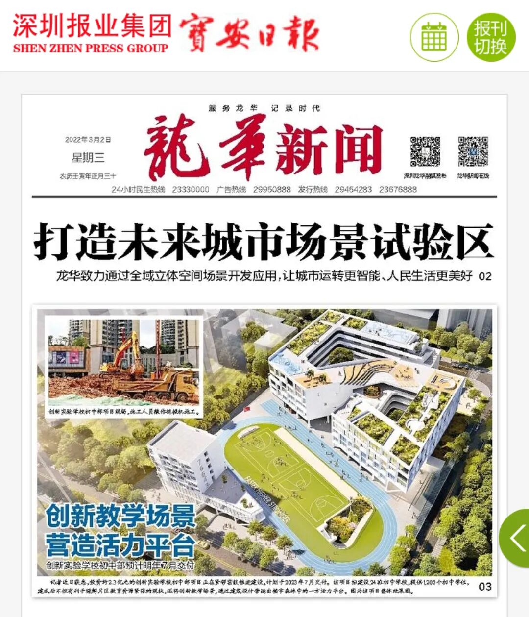 深圳市龙华区创新实验学校为深圳市龙华区教育局下属九年一贯制公办学校。据《宝安日报》报道,项目已于2月15日正式复工,正在进行基坑支护与土石方工程施工,预计2023年7月完工交付。